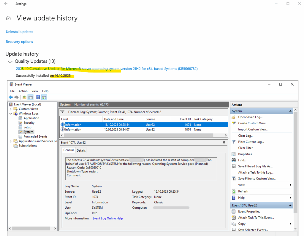 As already shown in Part 1, we can determine when I reboot was triggered by automatic cumulative updates for example by using the event viewer.