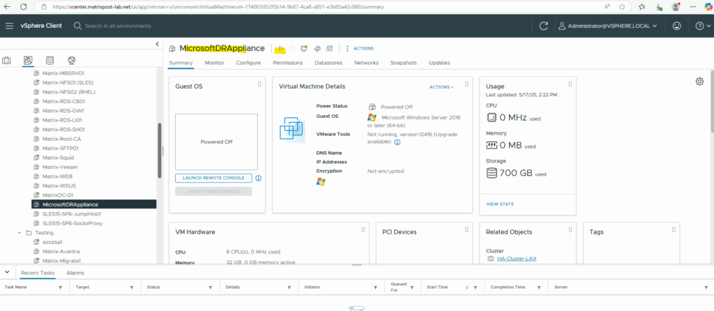 Because the VM Customization Specification was also setting the local Administrator account password, I will now first switch to use a remote desktop connection.
