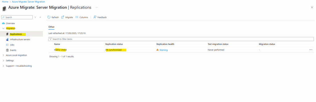 We will now see our protected virtual machine under Migration and modernization, here click on the digit for Replications -> Azure VM as shown below.