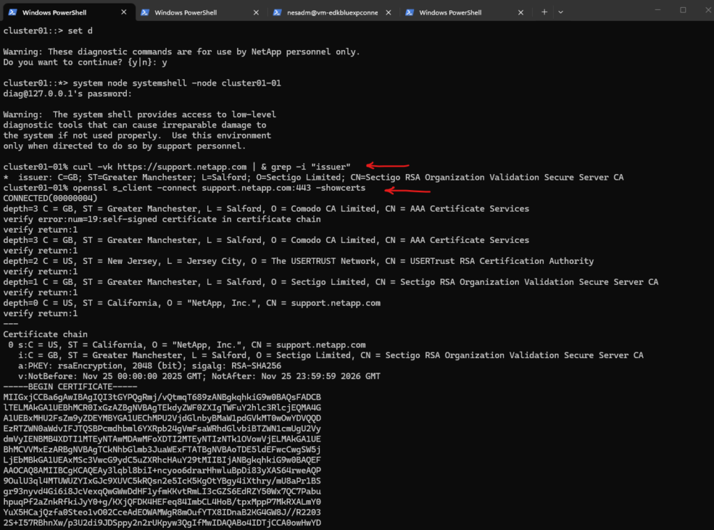 cluster01::> set d cluster01::*> system node systemshell -node cluster01-01 cluster01-01% curl -vk https://support.netapp.com | & grep -i "issuer" cluster01-01% openssl s_client -connect support.netapp.com:443 -showcerts