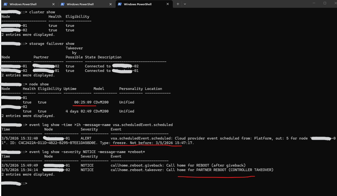 matrixcvo::> cluster show matrixcvo::> storage failover show matrixcvo::> node show matrixcvo::> event log show -time >1h -message-name vsa.scheduledEvent.scheduled matrixcvo::> event log show -severity NOTICE -message-name *reboot*