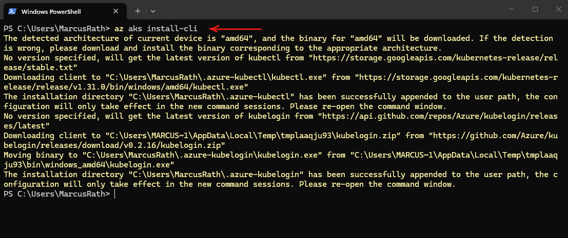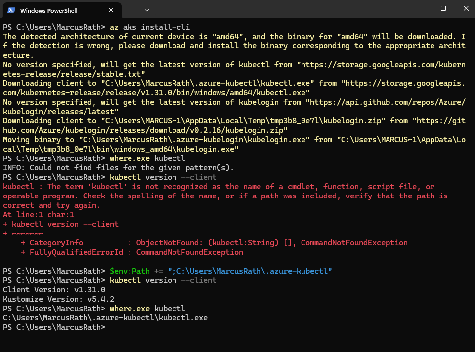 PS> $env:Path += ";C:\Users\MarcusRath\.azure-kubectl"