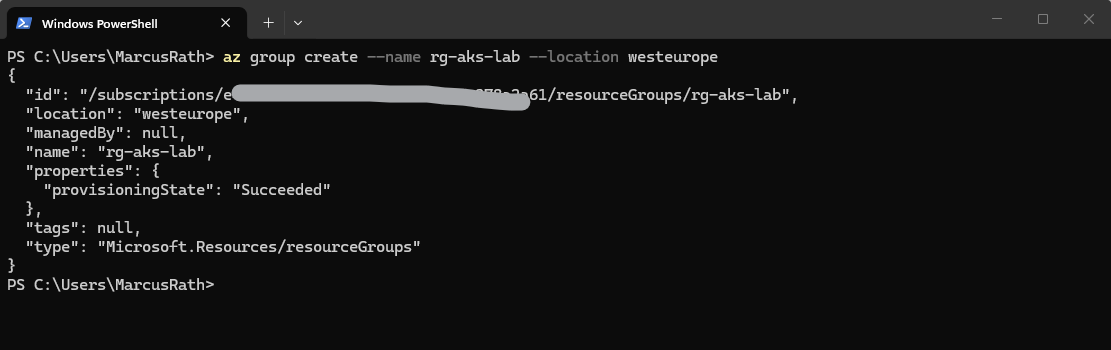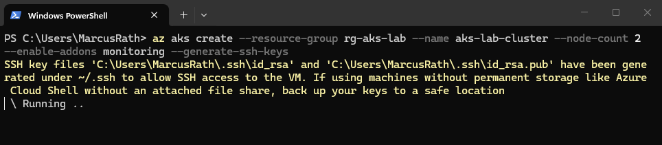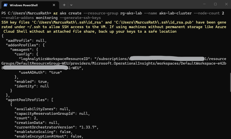 PS> az aks create --resource-group rg-aks-lab --name aks-lab-cluster --node-count 2 --enable-addons monitoring --generate-ssh-keys