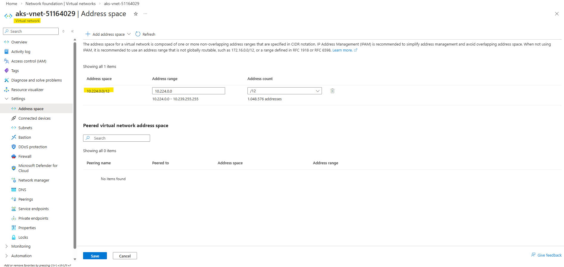Here, we deploy the AKS cluster into the existing subnet for the worker nodes, while using Azure CNI Overlay for pod networking. This separates node and pod IP addressing, with pods using a dedicated private CIDR instead of consuming VNet IPs.