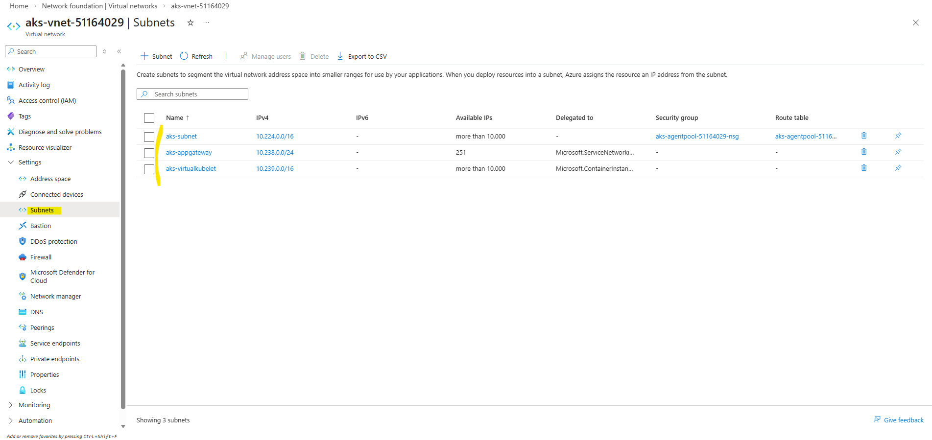 The aks-subnet is used for the AKS nodes and pods, the aks-appgateway subnet is reserved for integration with Azure Application Gateway (for ingress scenarios), and the aks-virtualkubelet subnet is used for Azure Container Instances via Virtual Nodes.