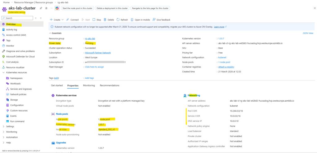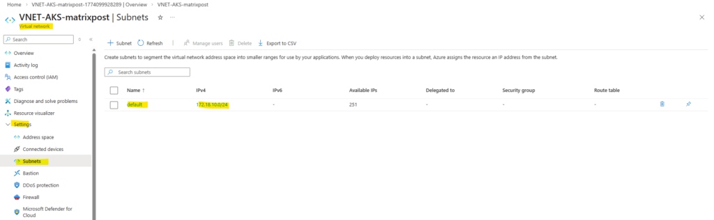 In this setup, the worker nodes are placed into the predefined subnet, while pod networking is handled using the Azure CNI overlay model.