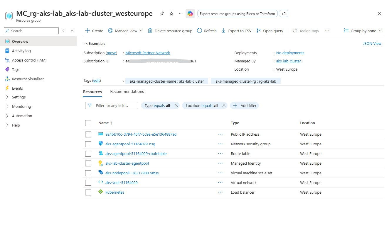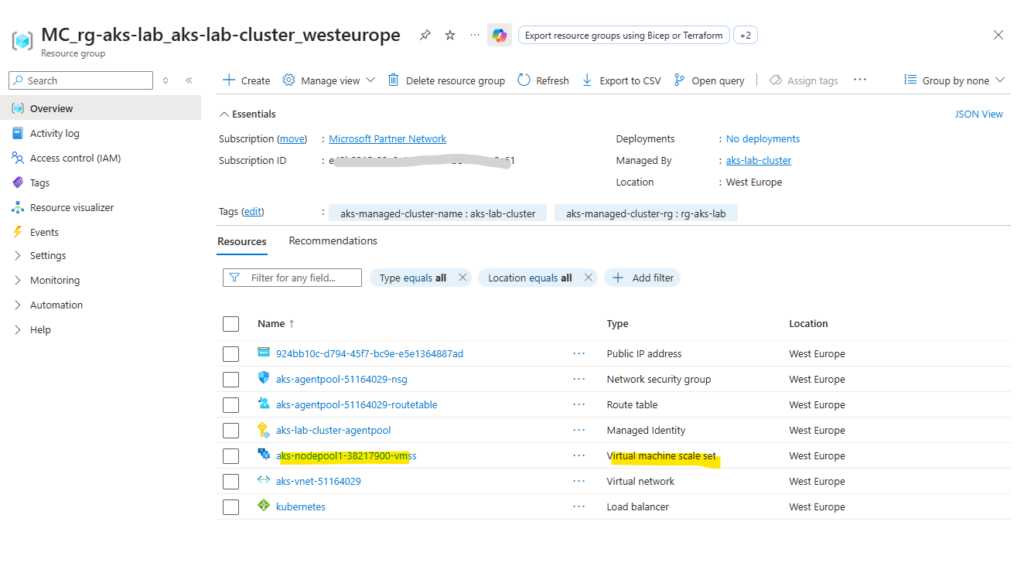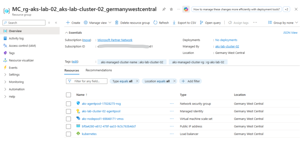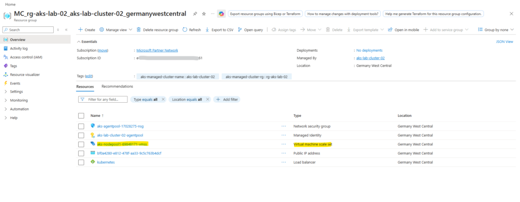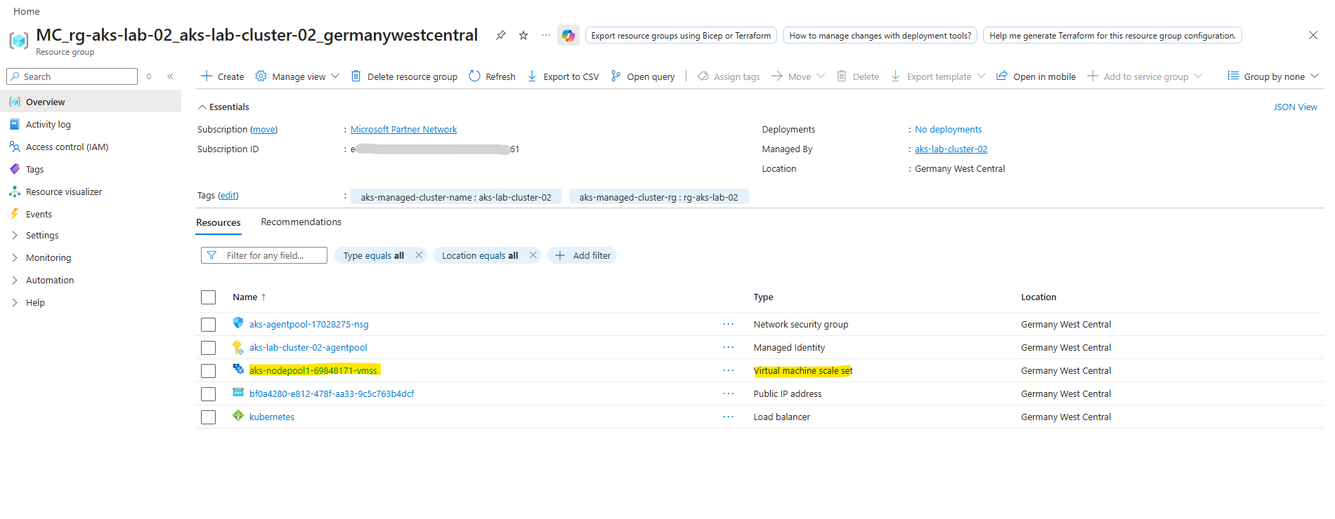 As previously the worker nodes (VMs) are not located in our AKS resource group (rg-aks-lab-02). Instead, AKS automatically creates a separate resource group called:
