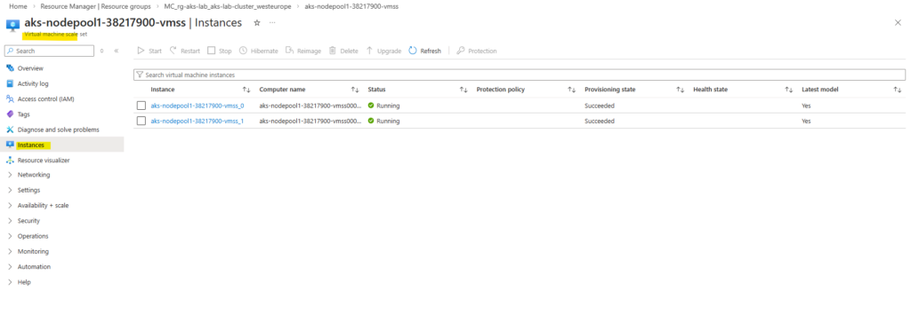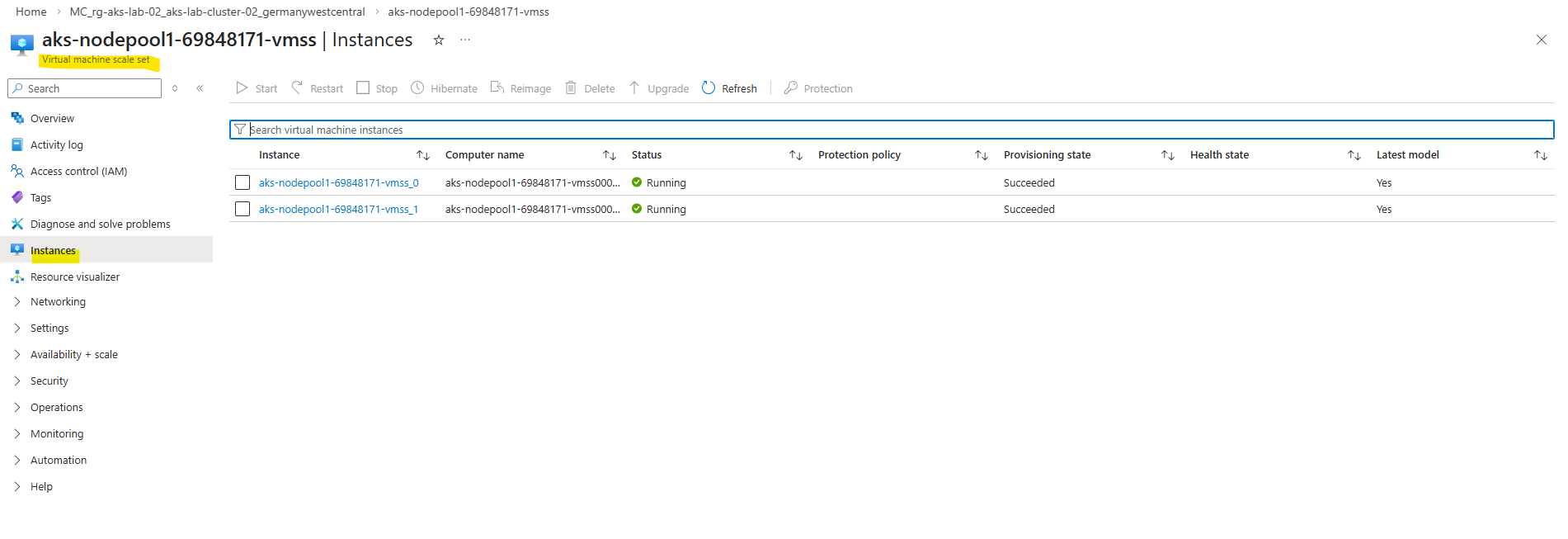 When opening the Virtual Machine Scale Set in the Azure Portal, the individual instances representing the worker nodes can be viewed. These instances correspond to the virtual machines that make up the AKS node pool.