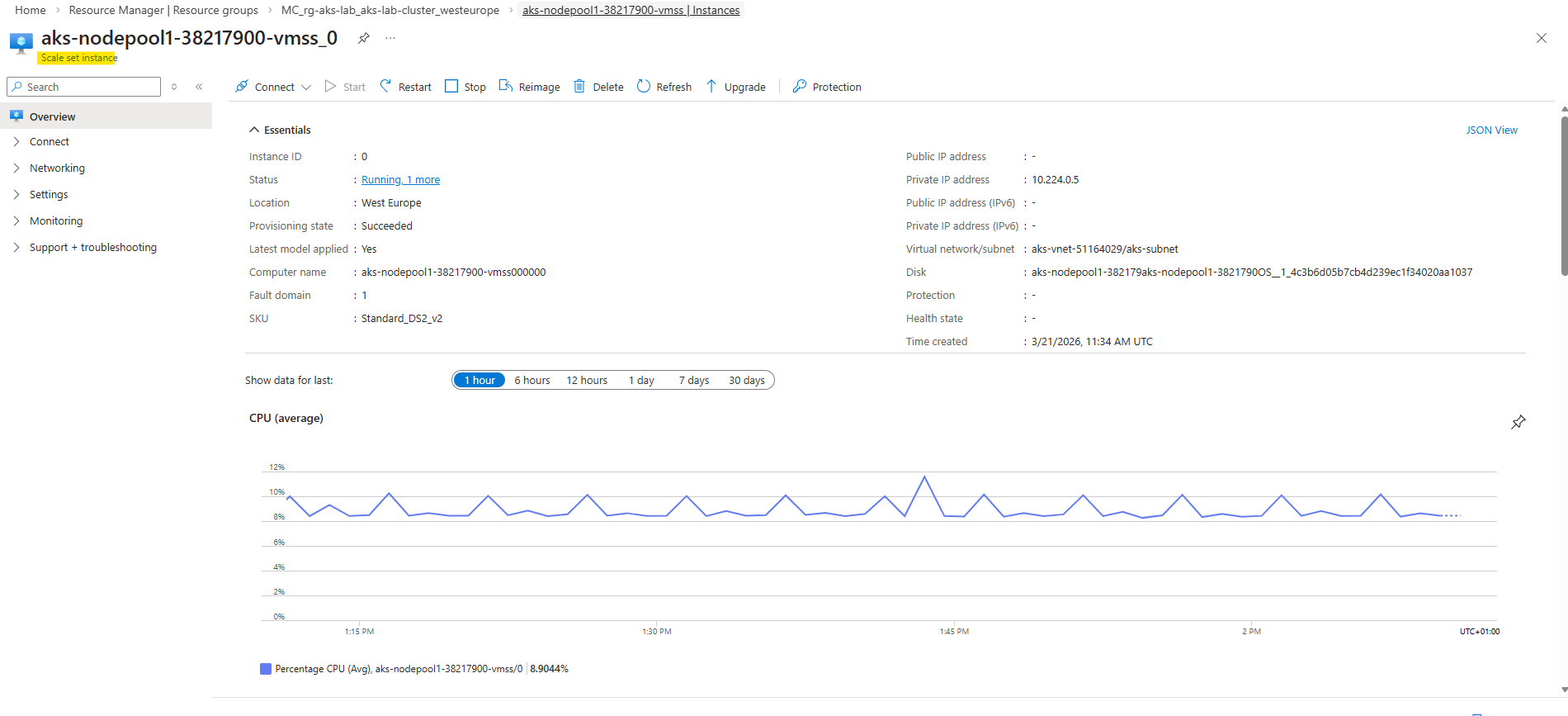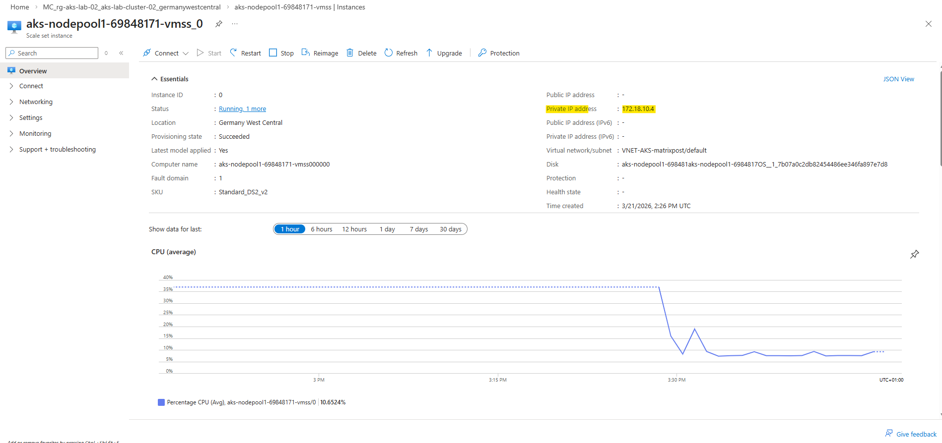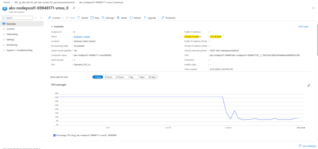 In the Azure Portal, the first Virtual Machine Scale Set instance shows that the worker node has received the private IP 172.18.10.4 from the custom VNet and subnet. This verifies that the node is deployed into the intended network configuration.