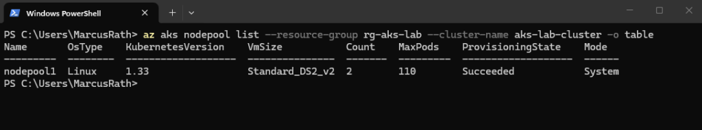 PS> az aks nodepool list --resource-group rg-aks-lab --cluster-name aks-lab-cluster -o table