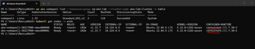The output also shows that AKS uses containerd as the container runtime on the worker nodes. Both AWS (EKS) and Google Cloud (GKE) also use containerd as the container runtime, following the deprecation of Docker (Dockershim) in Kubernetes.