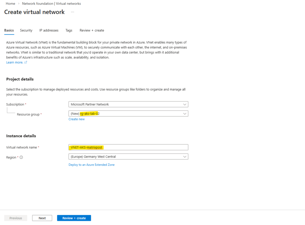 For this lab environment, I will create a dedicated Azure Virtual Network (VNet) for the AKS cluster to keep the setup simple and isolated.