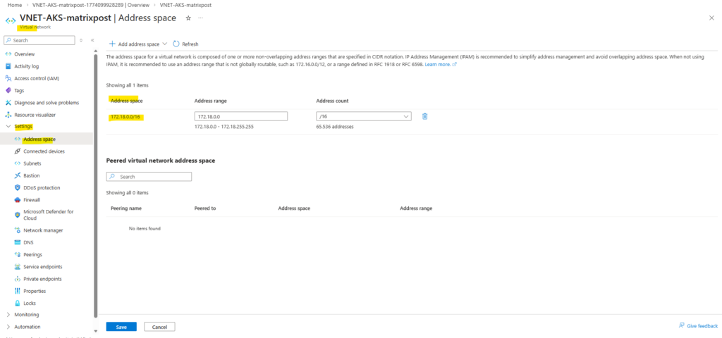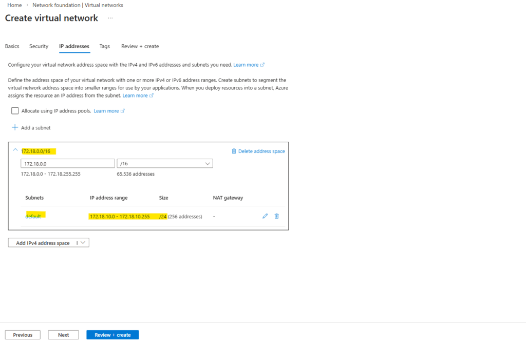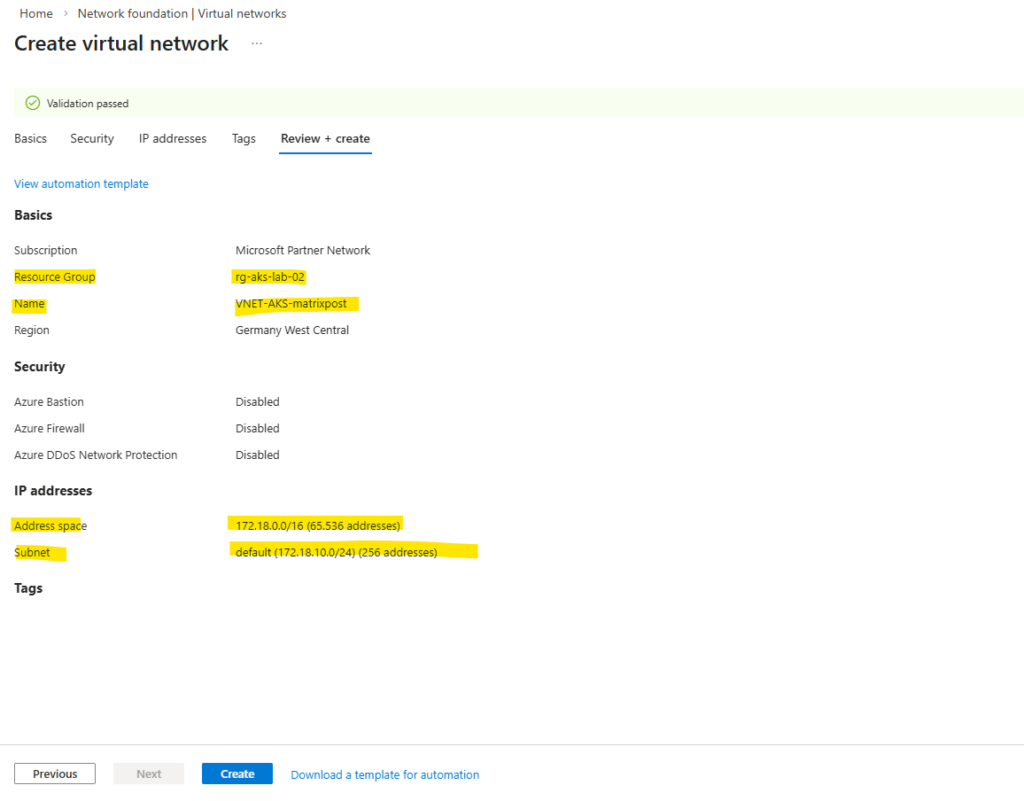 For this lab, I will create a dedicated VNet with the address space 172.18.0.0/16 and a subnet 172.18.10.0/24 for the AKS cluster. This subnet will host the worker nodes and, depending on the networking model, also the pod IP addresses.