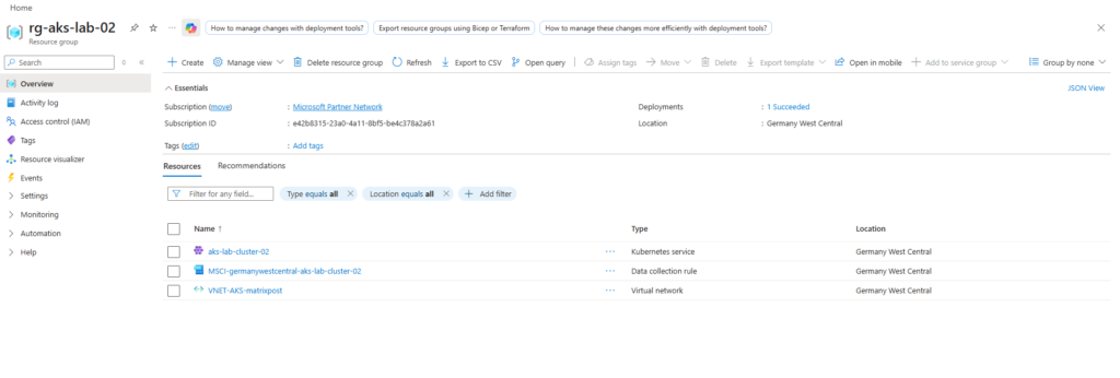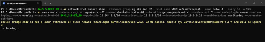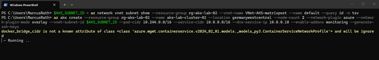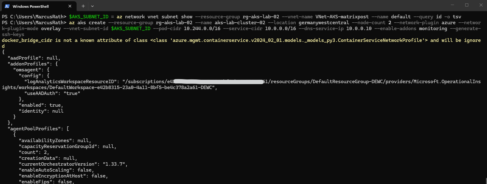 PS>  az aks create --resource-group rg-aks-lab-02 --name aks-lab-cluster-02 --location germanywestcentral --node-count 2 --network-plugin azure --network-plugin-mode overlay --vnet-subnet-id $AKS_SUBNET_ID --pod-cidr 10.244.0.0/16 --service-cidr 10.0.0.0/16 --dns-service-ip 10.0.0.10 --enable-addons monitoring --generate-ssh-keys