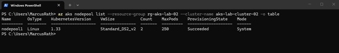 PS> az aks nodepool list --resource-group rg-aks-lab-02 --cluster-name aks-lab-cluster-02 -o table