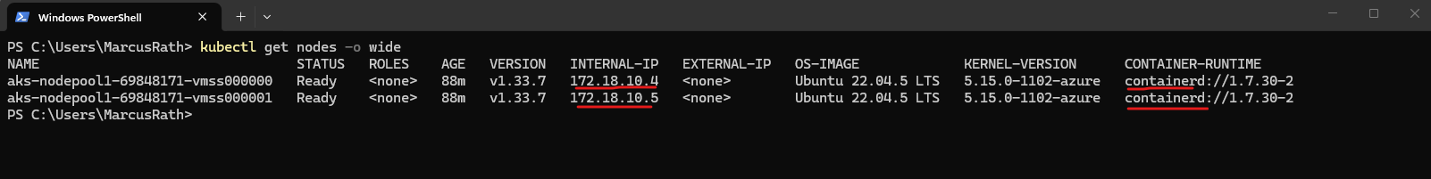 Using the command below, we can display detailed information about the cluster nodes, including their internal IP addresses (now assigned from our custom virtual network and subnet) and underlying infrastructure.