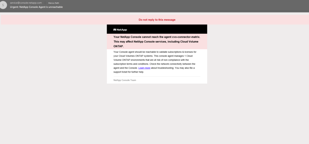 A few hours later after shutting down the Agent (connector VM), we also get an email that the NetApp console cannot reach our Agent (connector VM).