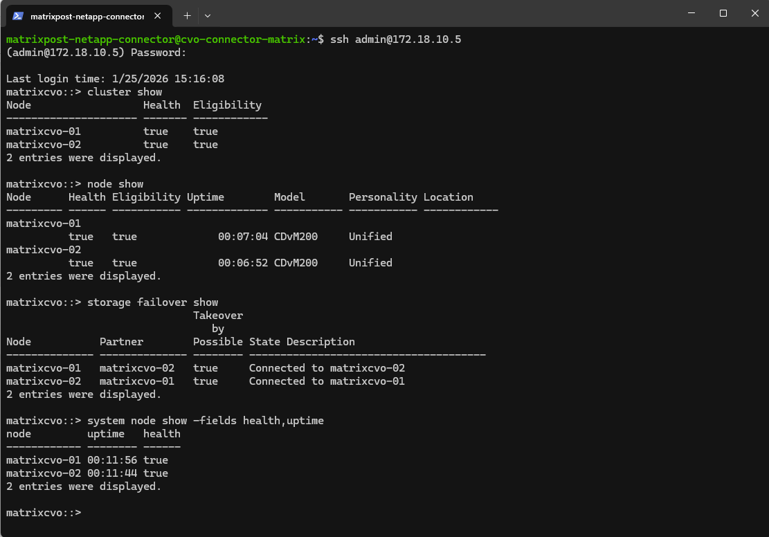 matrixcvo::> cluster show matrixcvo::> node show matrixcvo::> storage failover show matrixcvo::> system node show -fields health,uptime