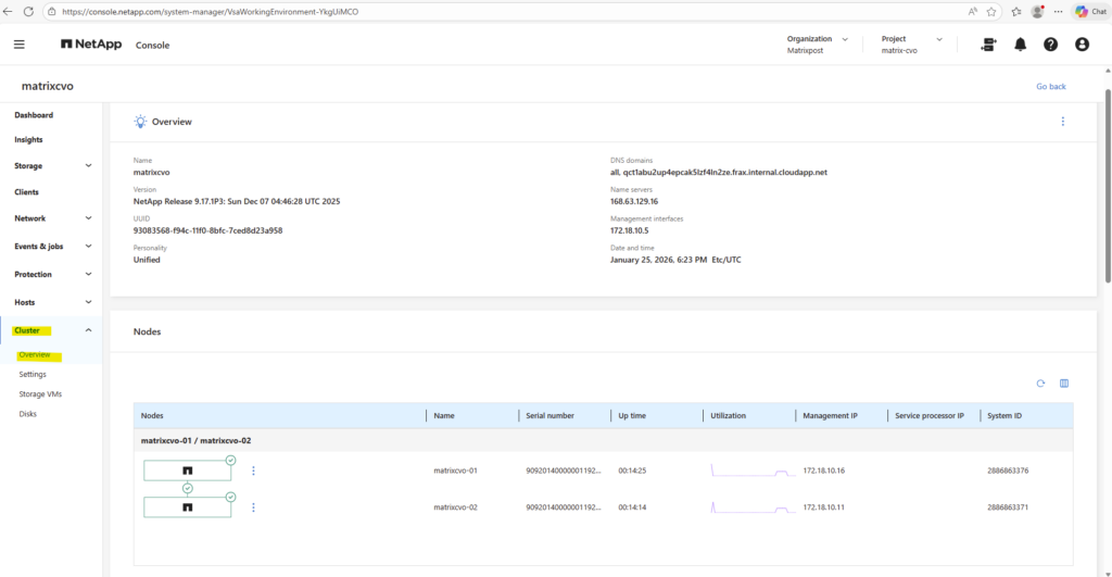 This can be done from the ONTAP CLI, the NetApp Console or directly in ONTAP System Manager, where both nodes should report a healthy state and the HA relationship should be active.