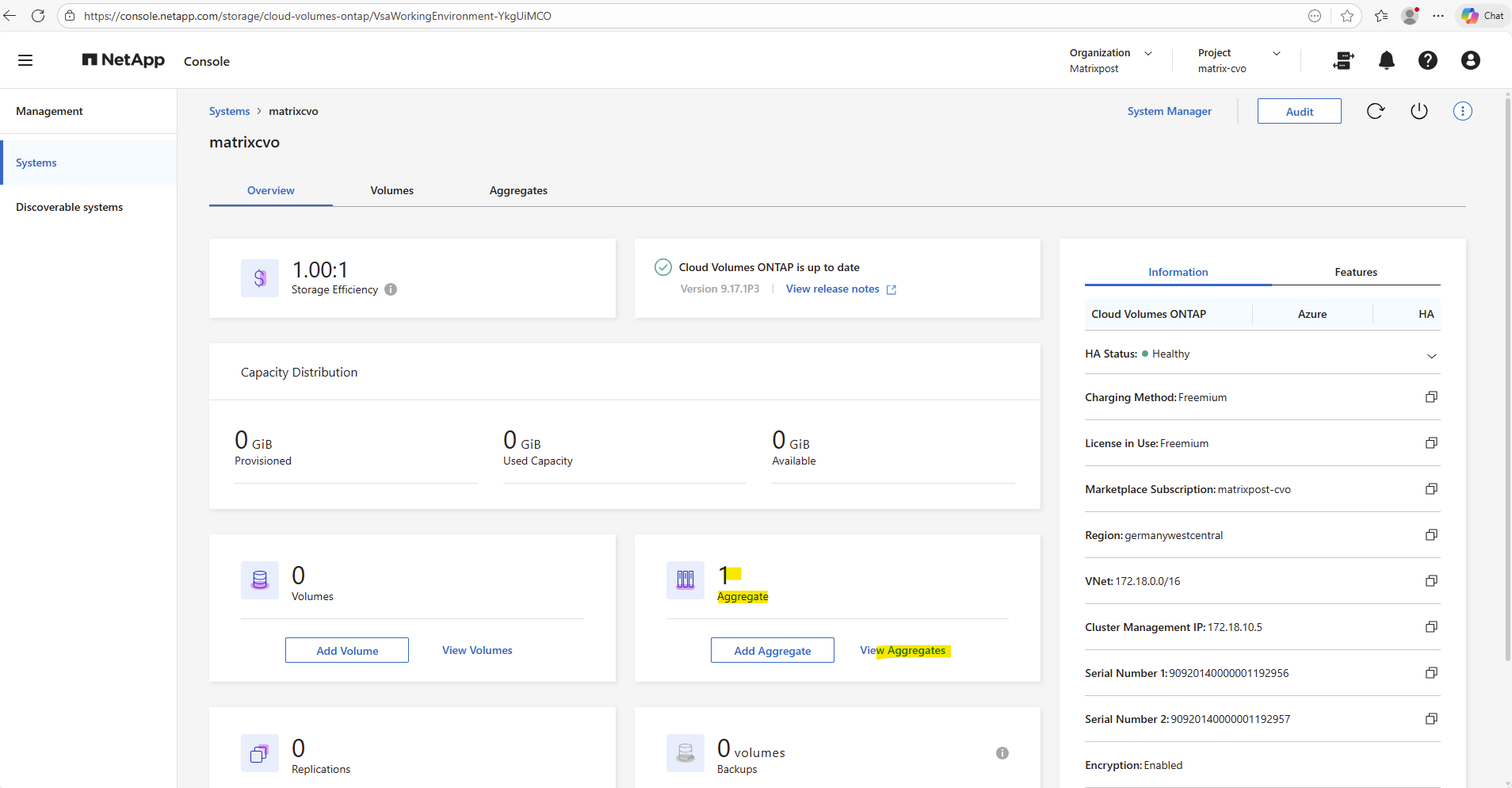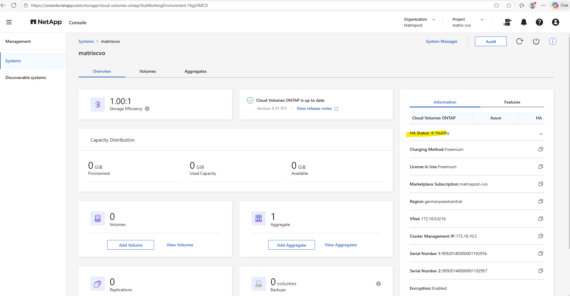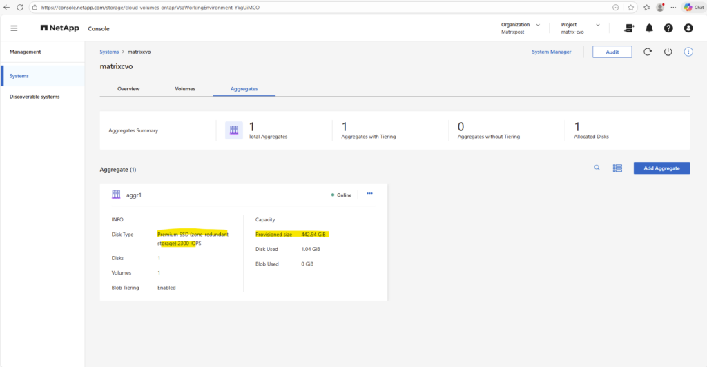 Once the Cloud Volumes ONTAP HA system is successfully deployed, the environment is technically ready but does not yet provide any usable storage.