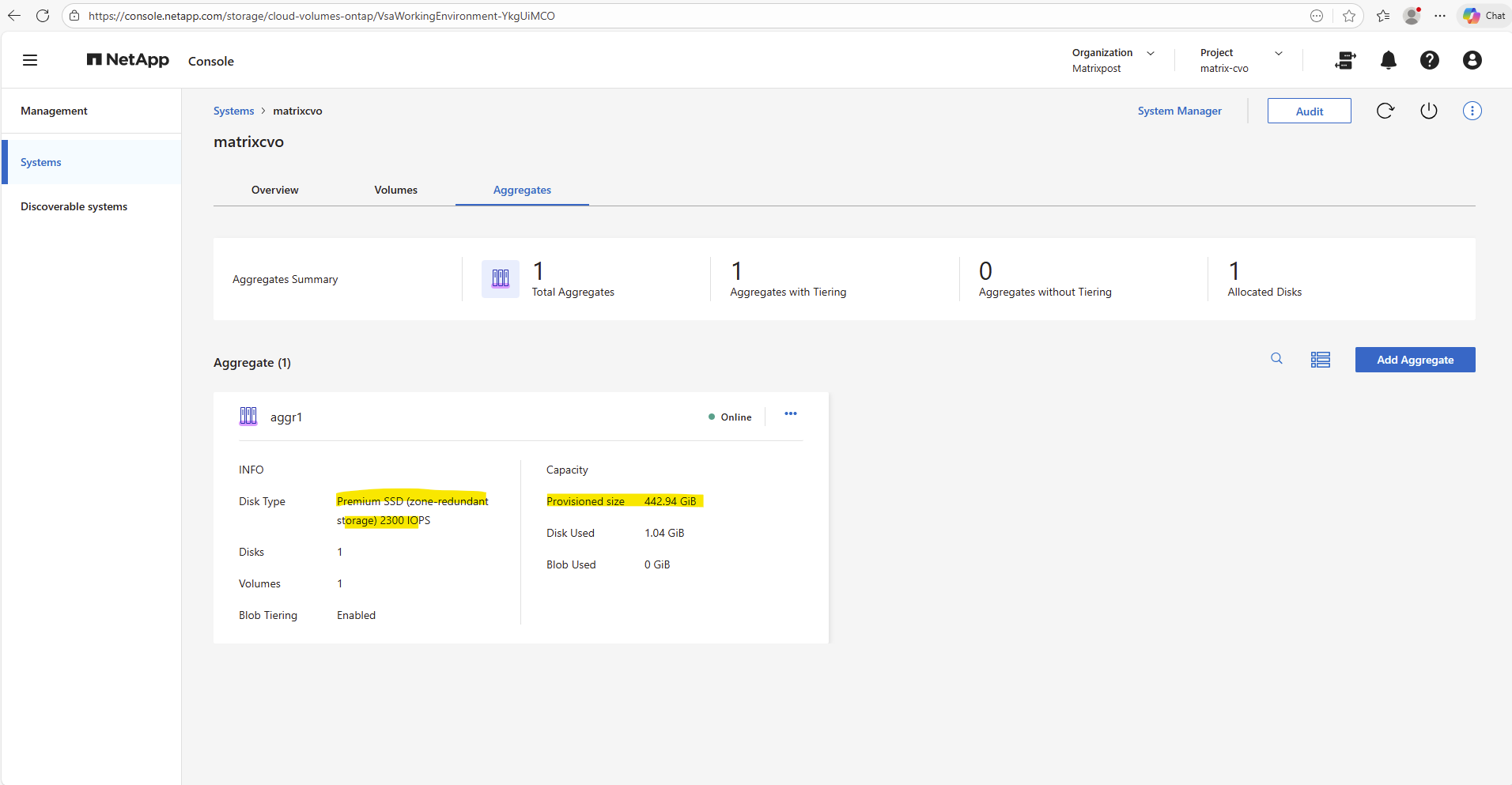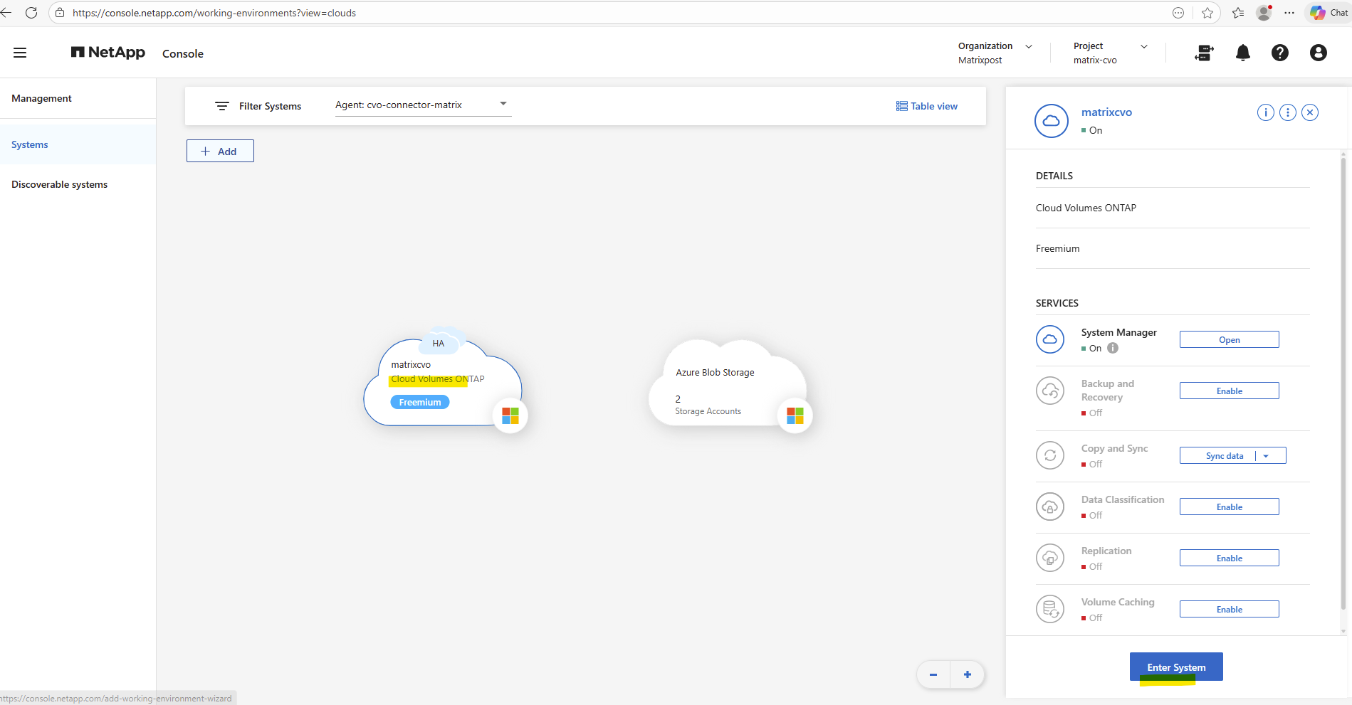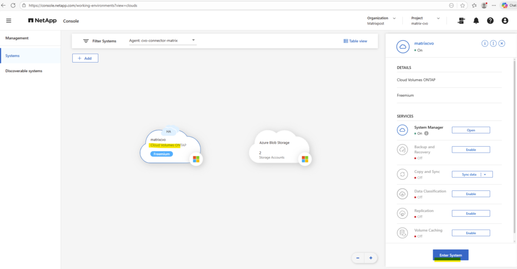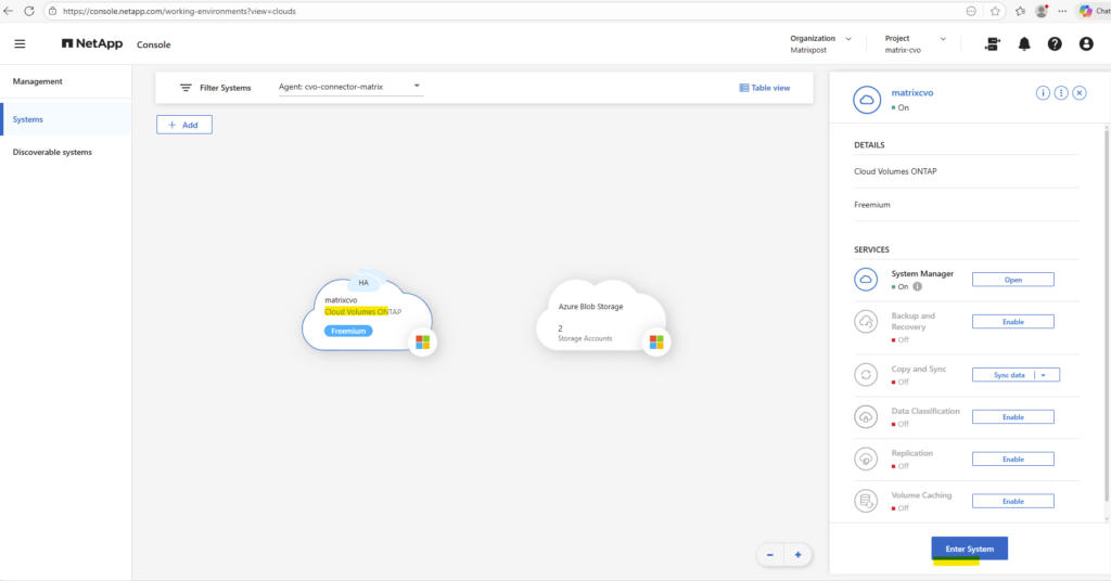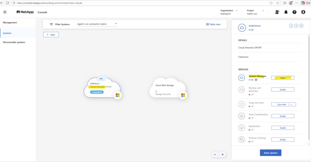 By using the NetApp console we can navigate to Management -> Systems, select the highlighted Cloud Volume ONTAP system and click on Enter System as shown below.