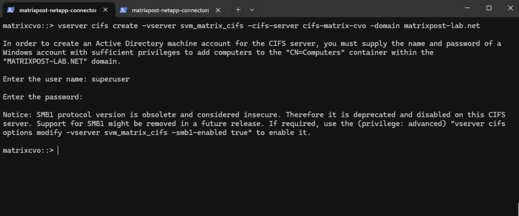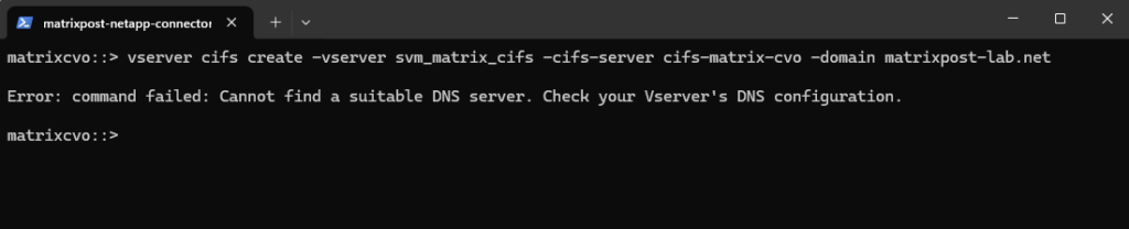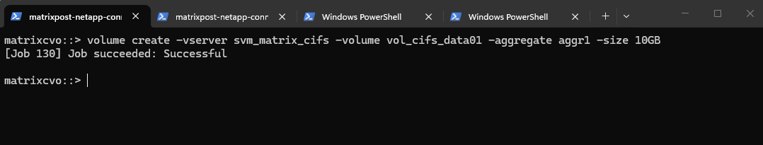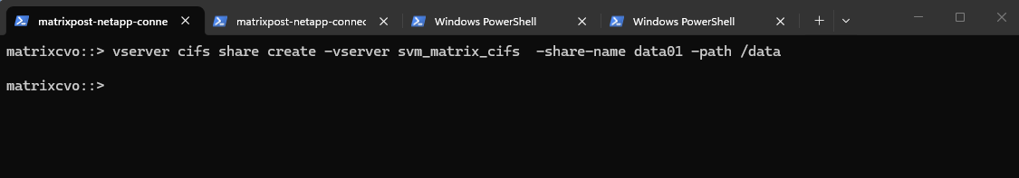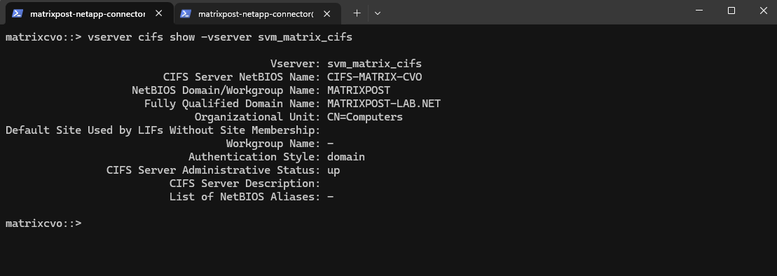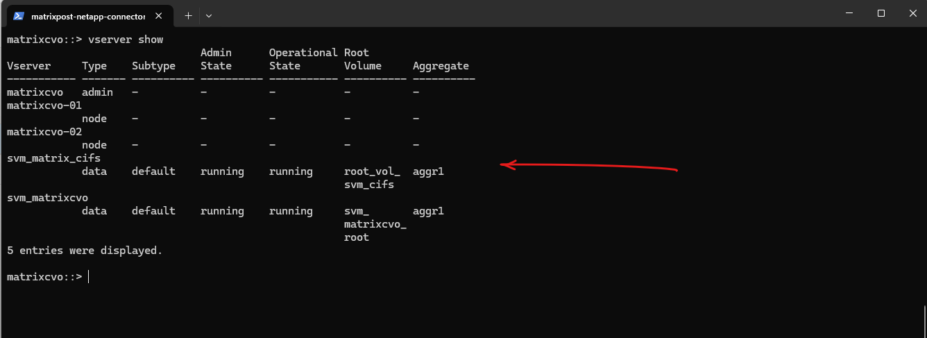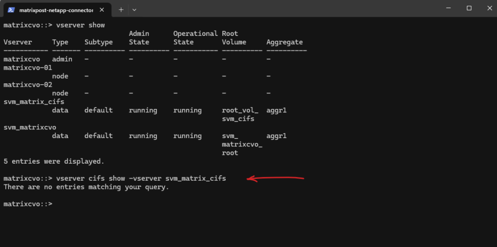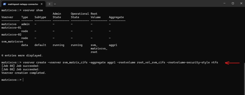 matrixcvo::> vserver create -vserver svm_matrix_cifs -aggregate aggr1 -rootvolume root_vol_svm_cifs -rootvolume-security-style ntfs