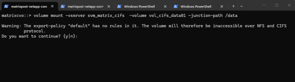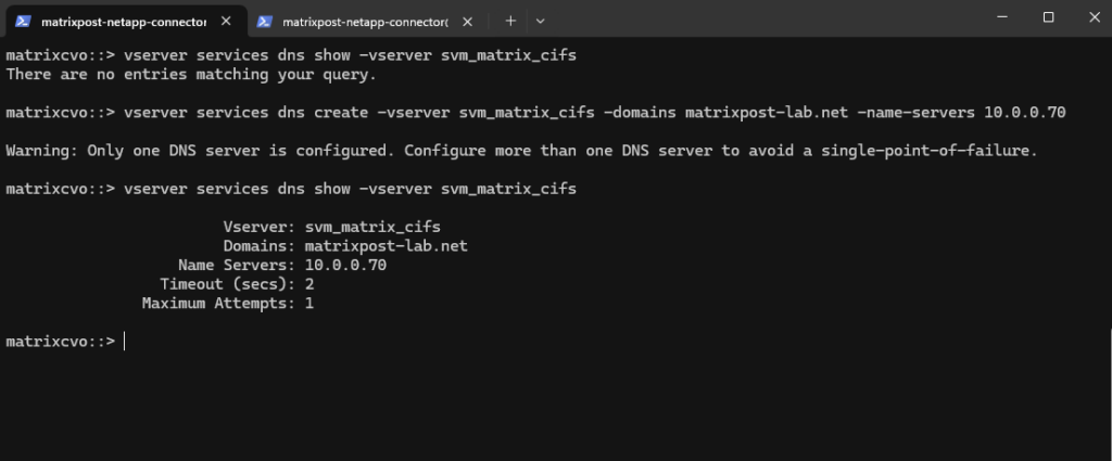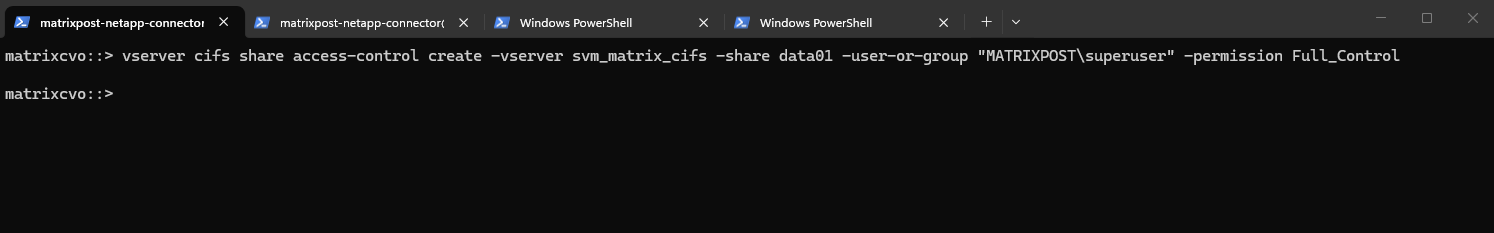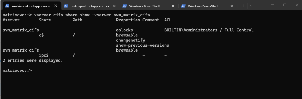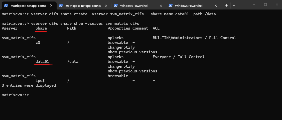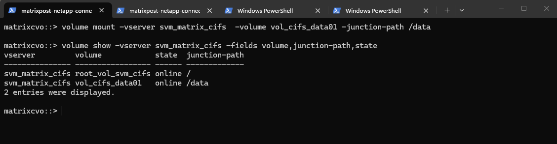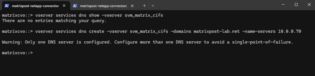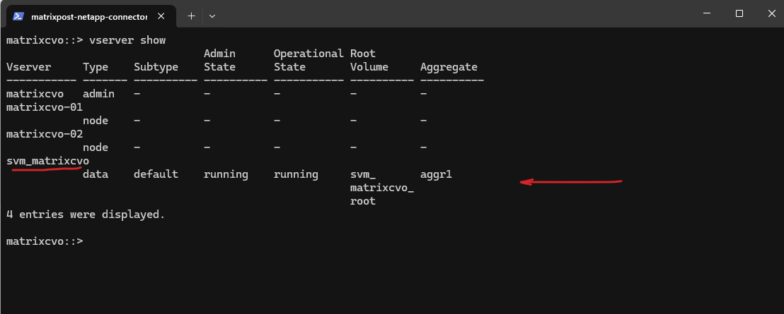 matrixcvo::> vserver create -vserver svm_matrix_cifs -aggregate aggr1 -rootvolume root_vol_svm_cifs -rootvolume-security-style ntfs