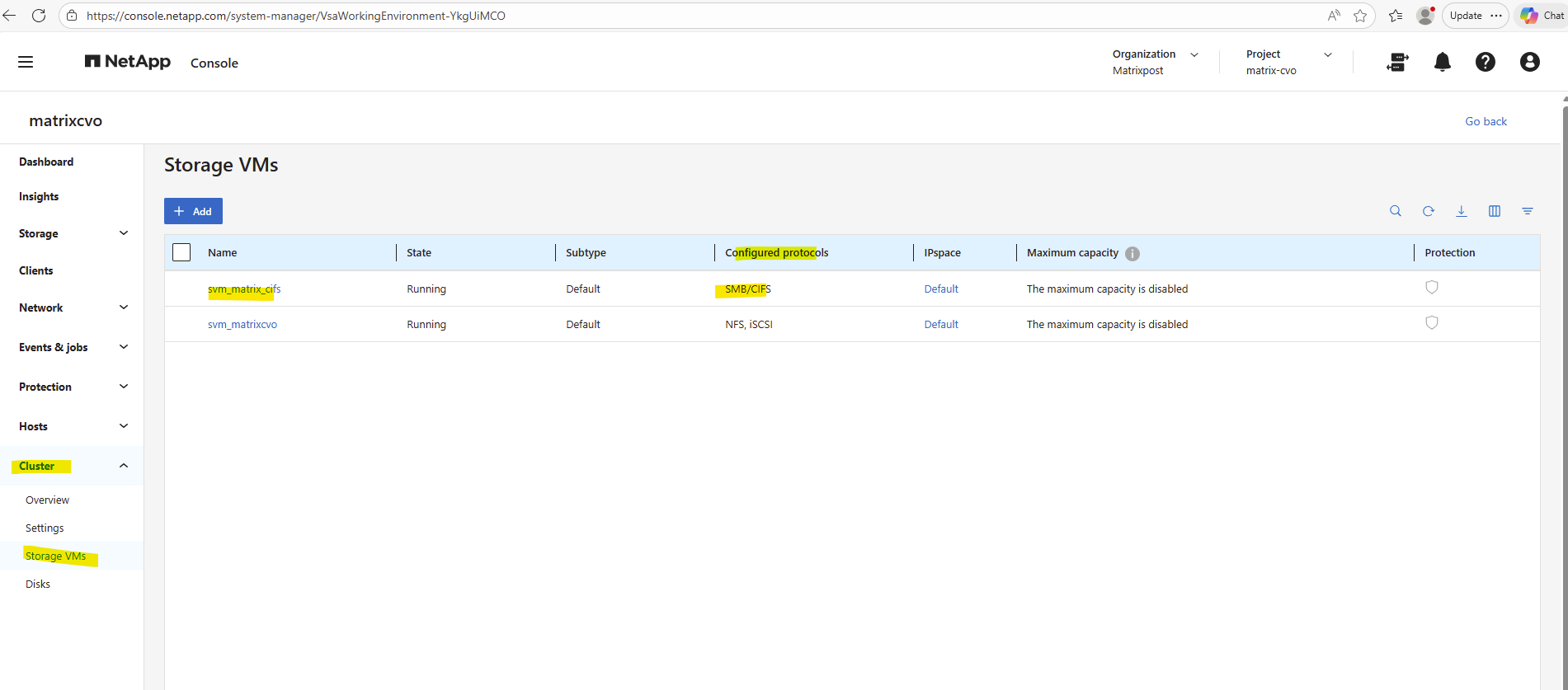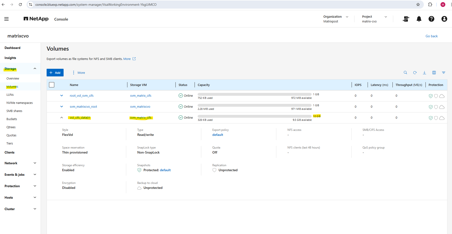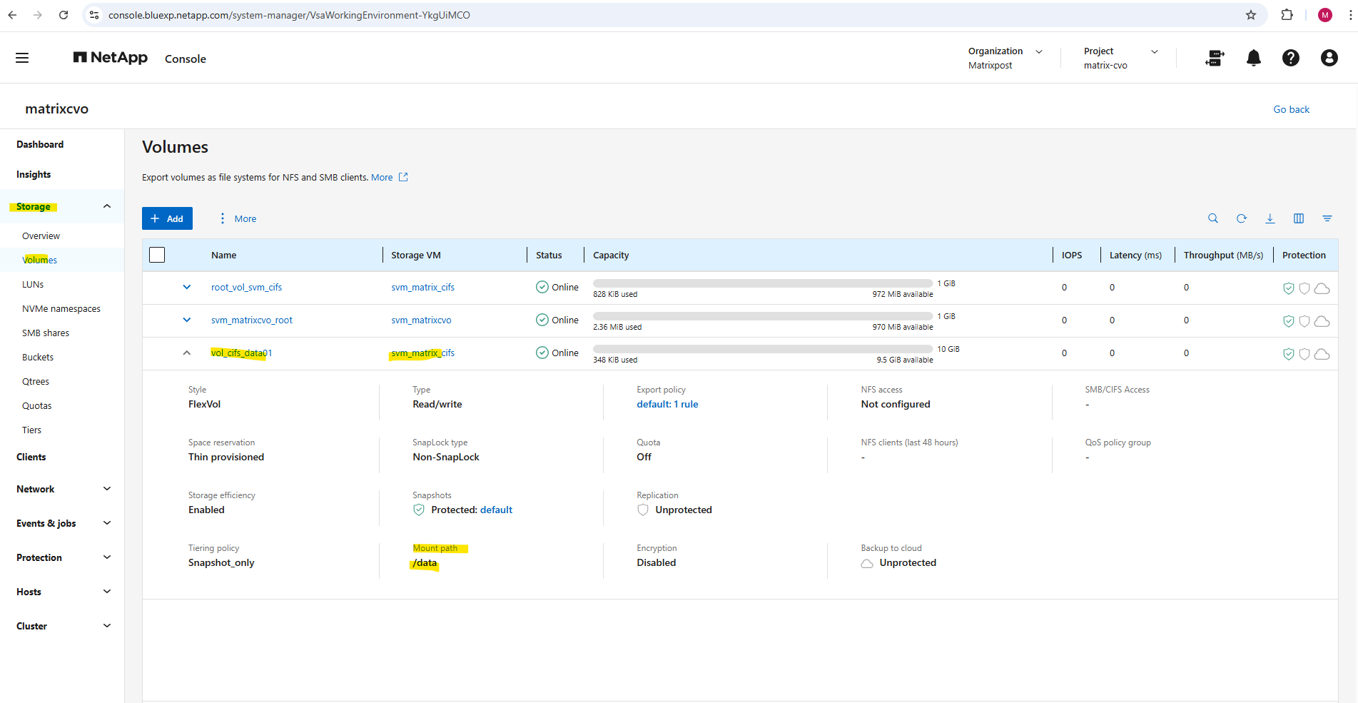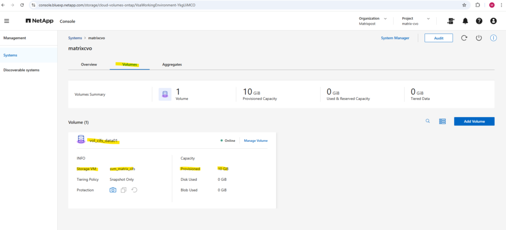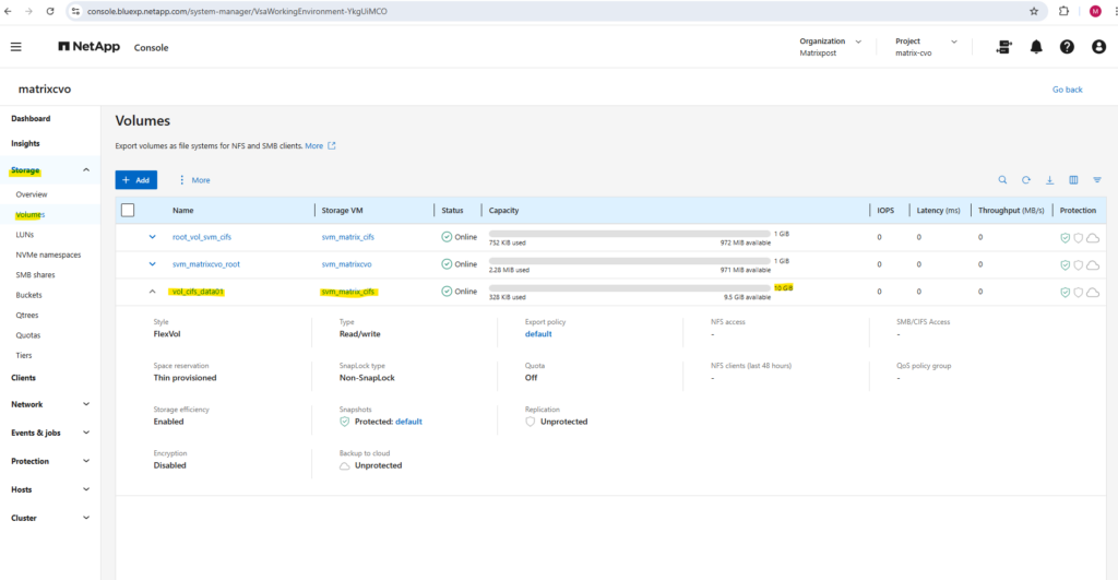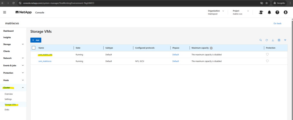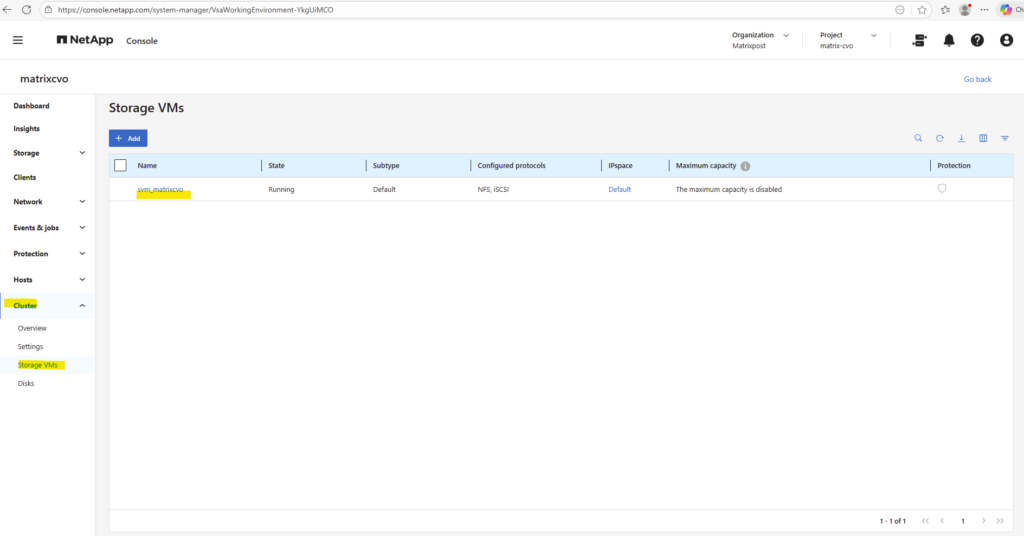 After deployment, the Cloud Volumes ONTAP system already contains a preconfigured data SVM shown below and named svm_matrixcvo.