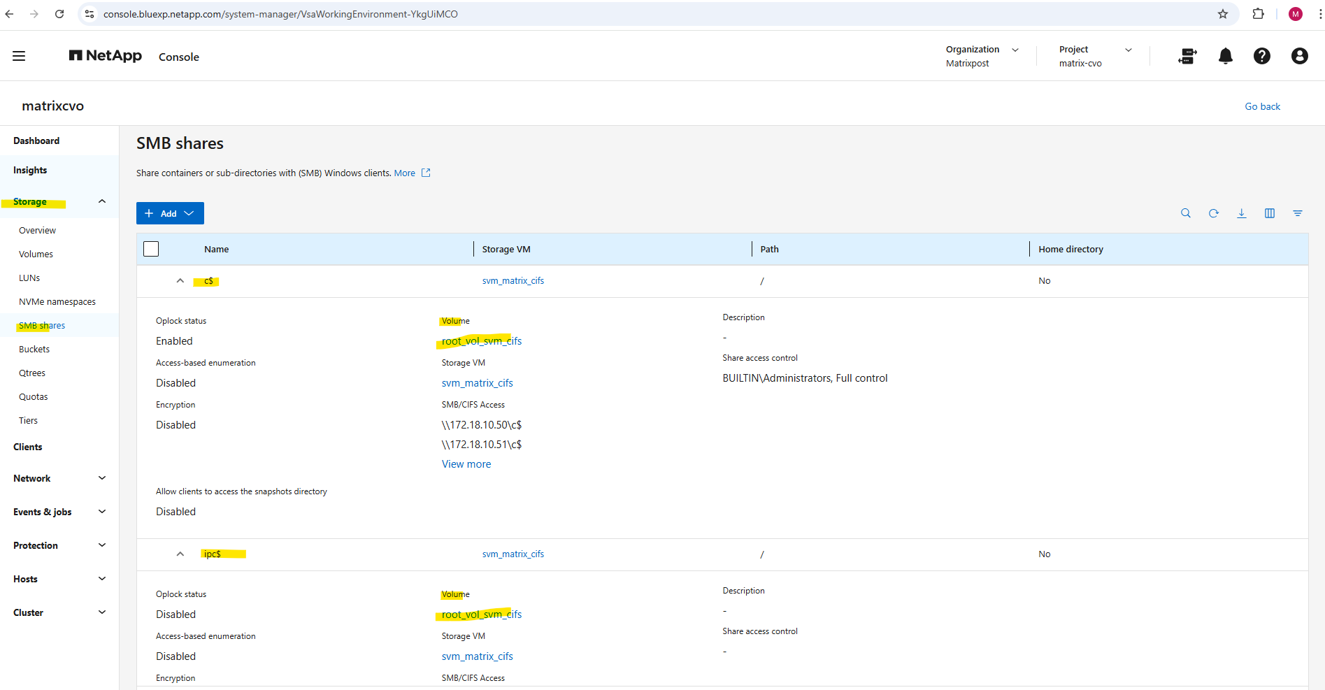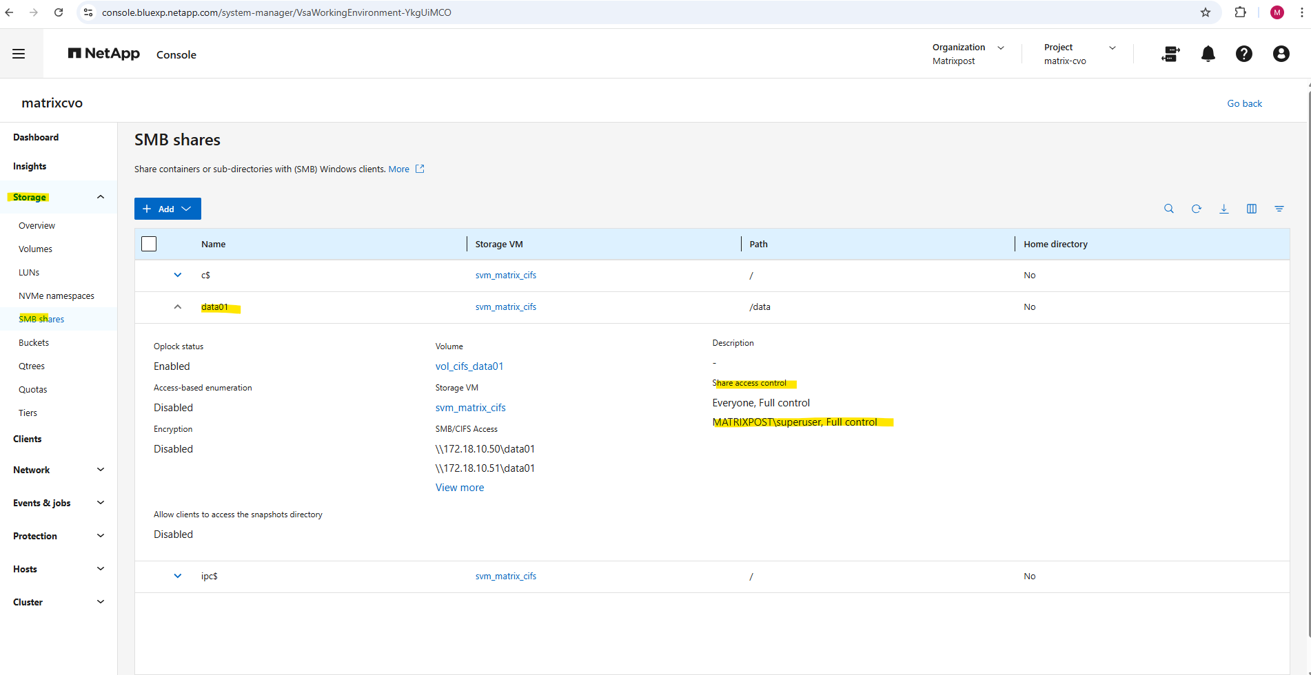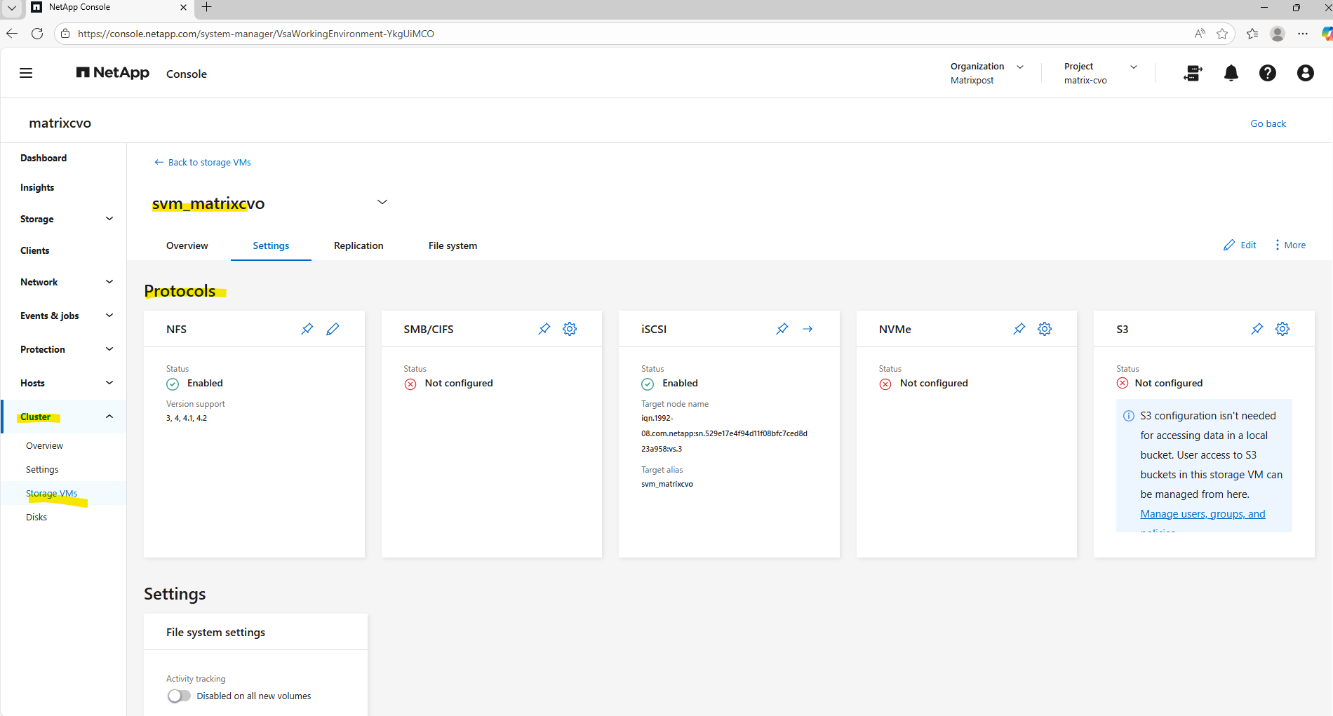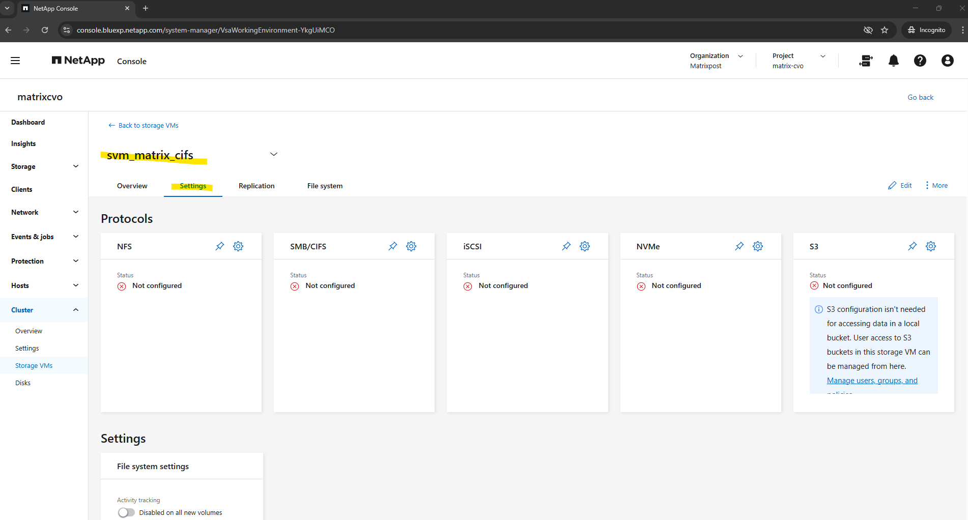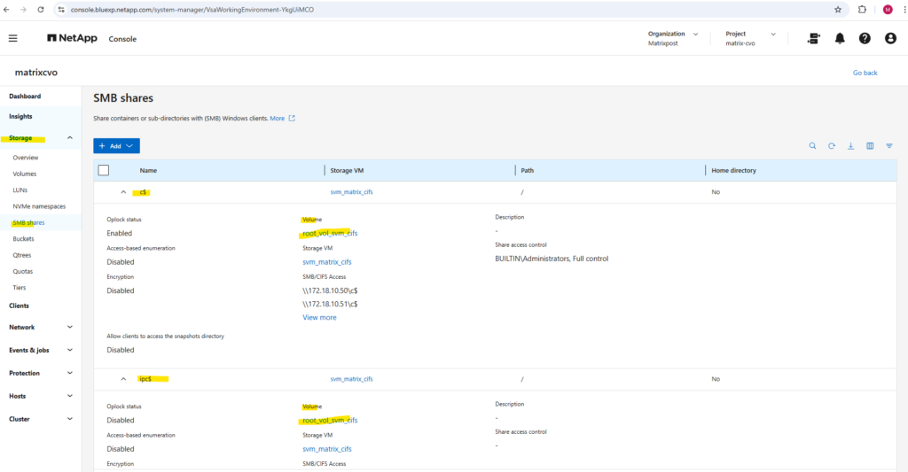 After deployment, the Cloud Volumes ONTAP system already contains a preconfigured data SVM shown below and named svm_matrixcvo.