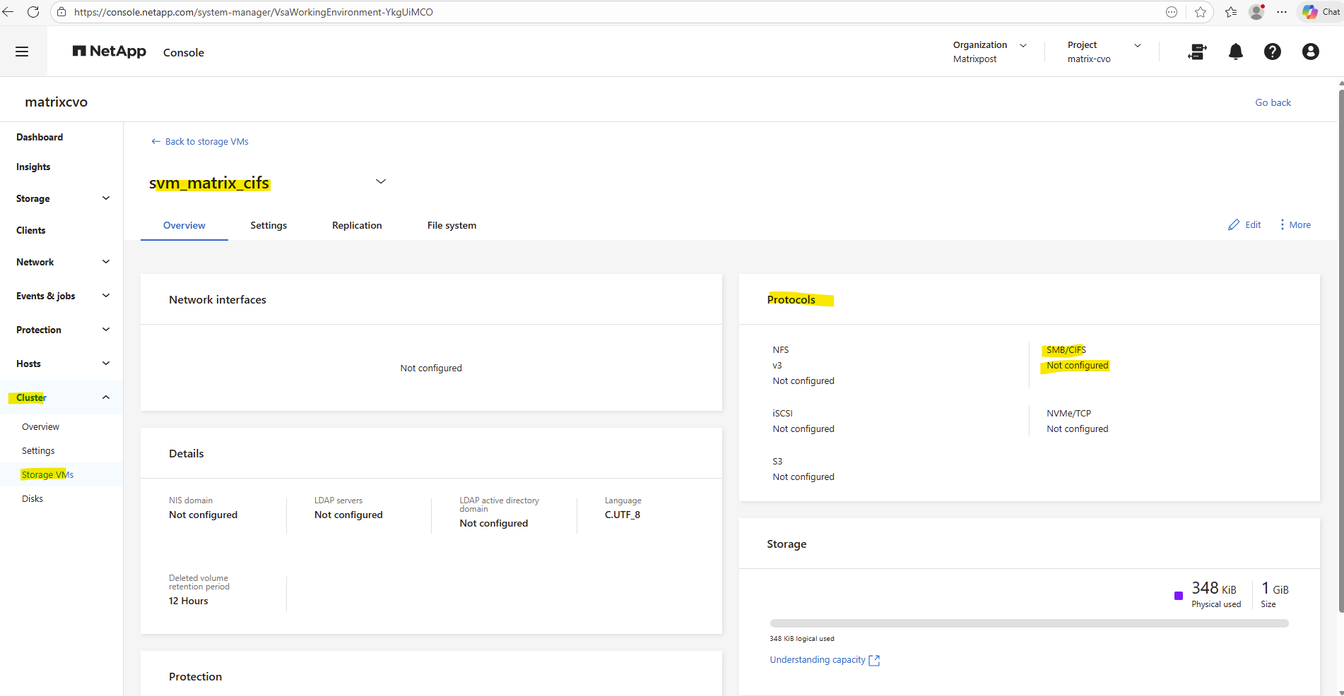 The already preconfigured data SVM we can also see in the ONTAP System Manager under Cluster -> Storage VMs.