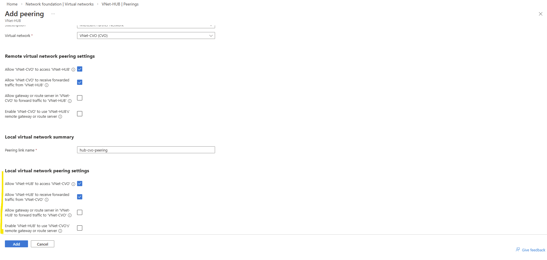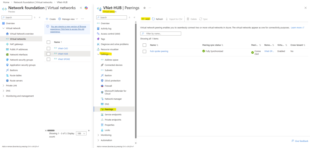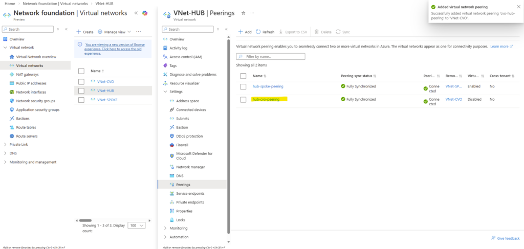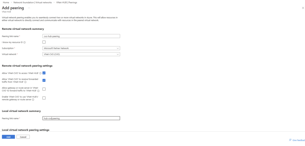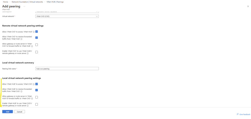 For the local virtual network check Allow ‘VNet-HUB’ to access ‘VNET-CVO’ and Allow ‘VNet-HUB’ to receive forwarded traffic from ‘VNet-CVO’.