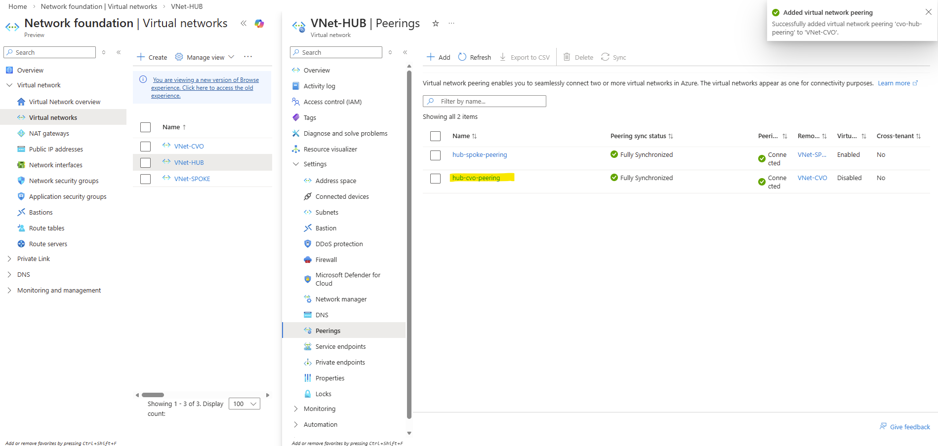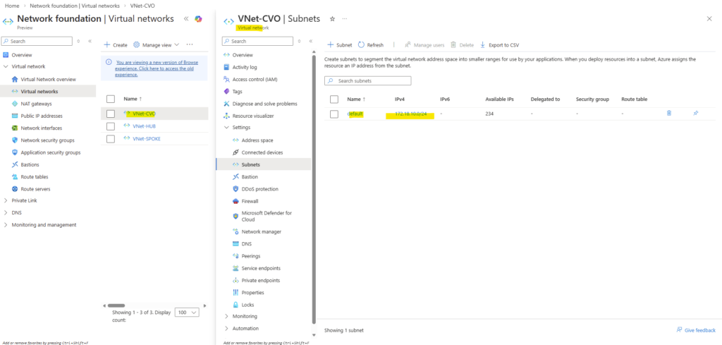 In this section, I’ll show how the CVO virtual network is peered with an existing hub VNet, which is already connected to my on-premises environment via a site-to-site IPsec VPN.