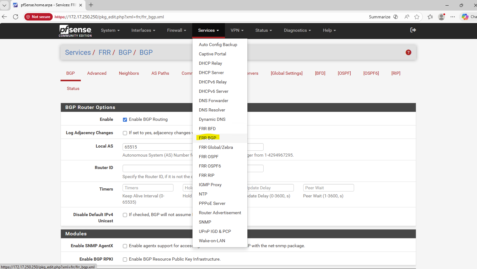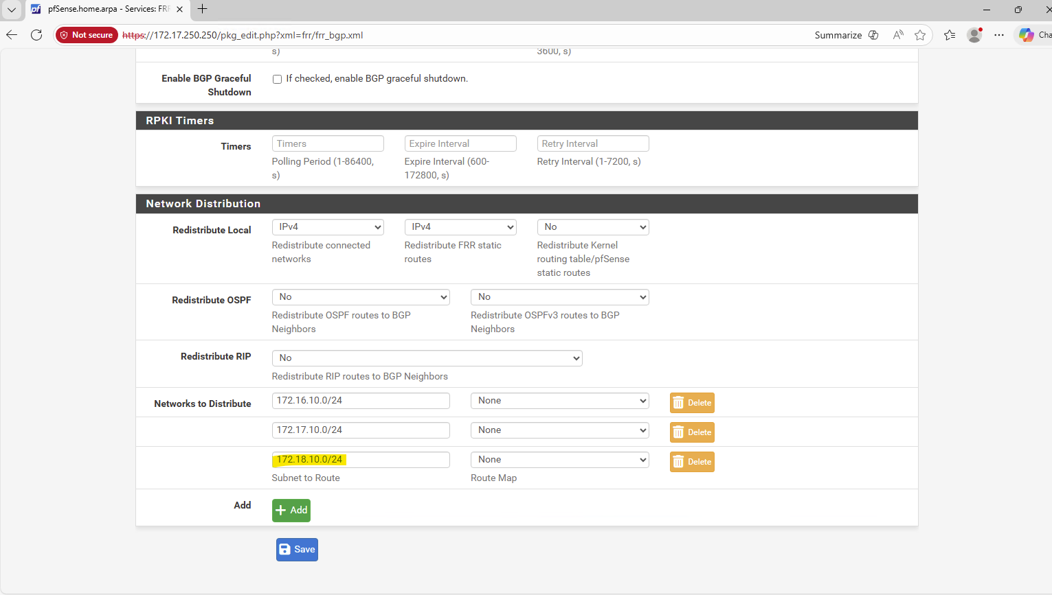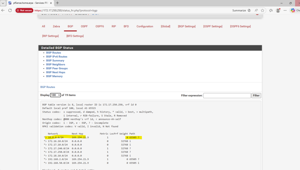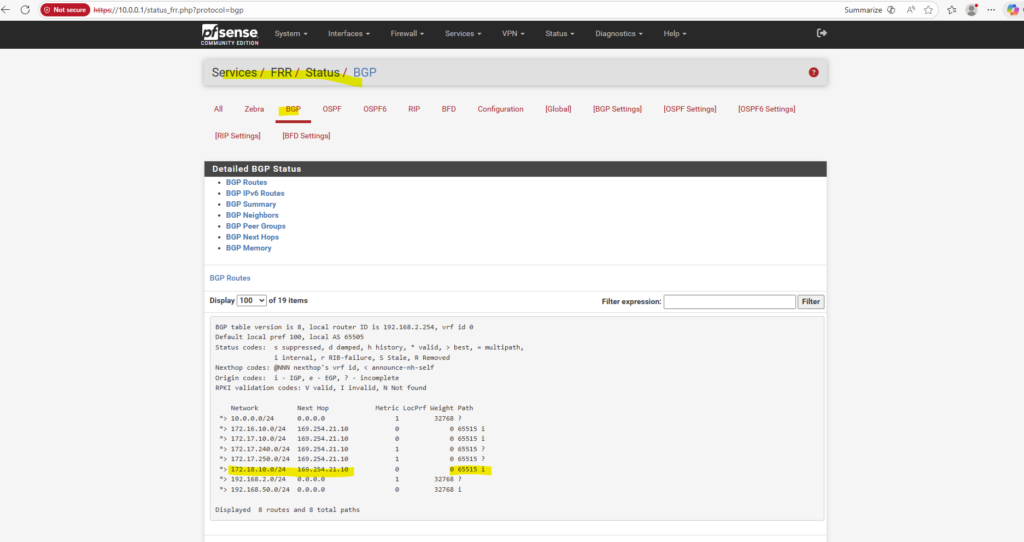 This route is advertised by the on-prem pfSense appliance to the pfSense appliance running in Azure by using BGP.