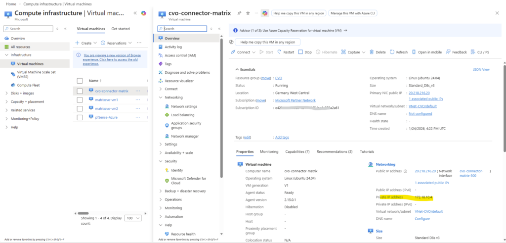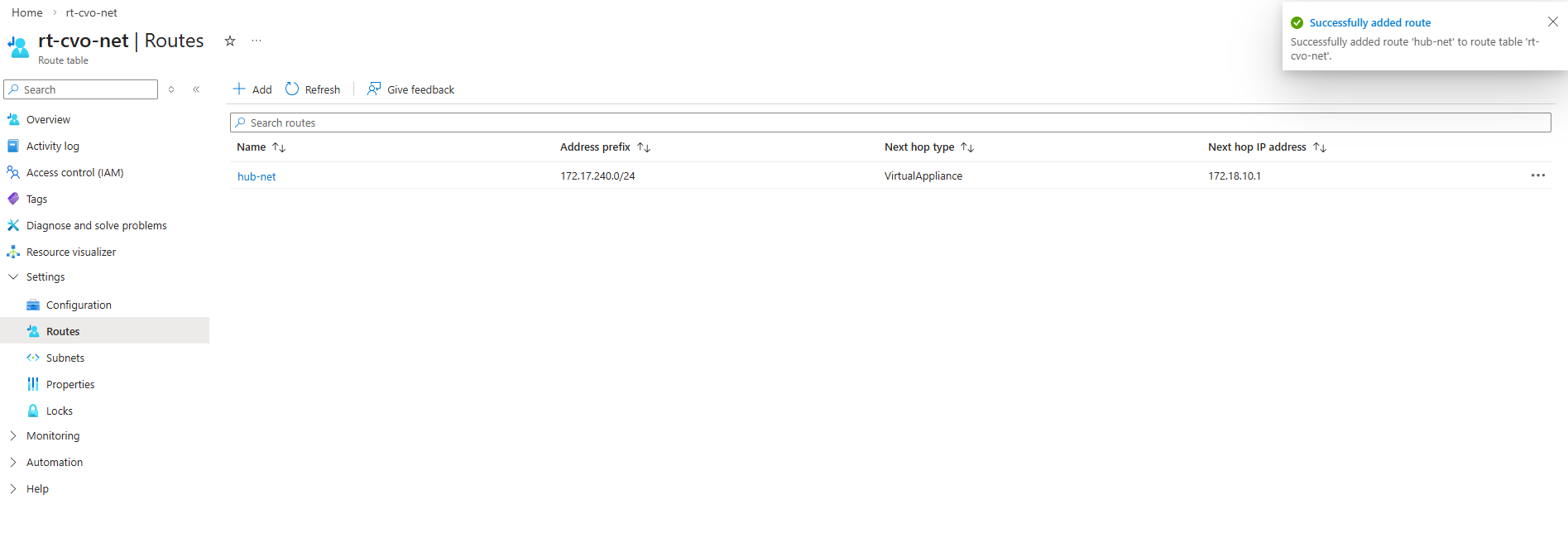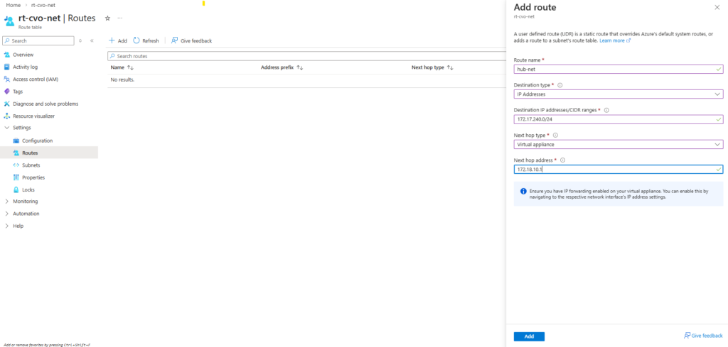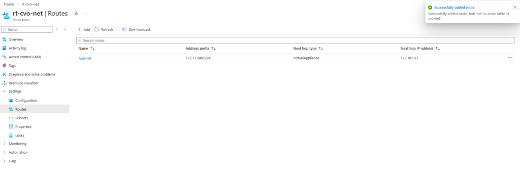 But the pfSense appliance in Azure so far doesn’t have a route to the virtual network for the CVO deployment with its subnet 172.18.10.0/24.