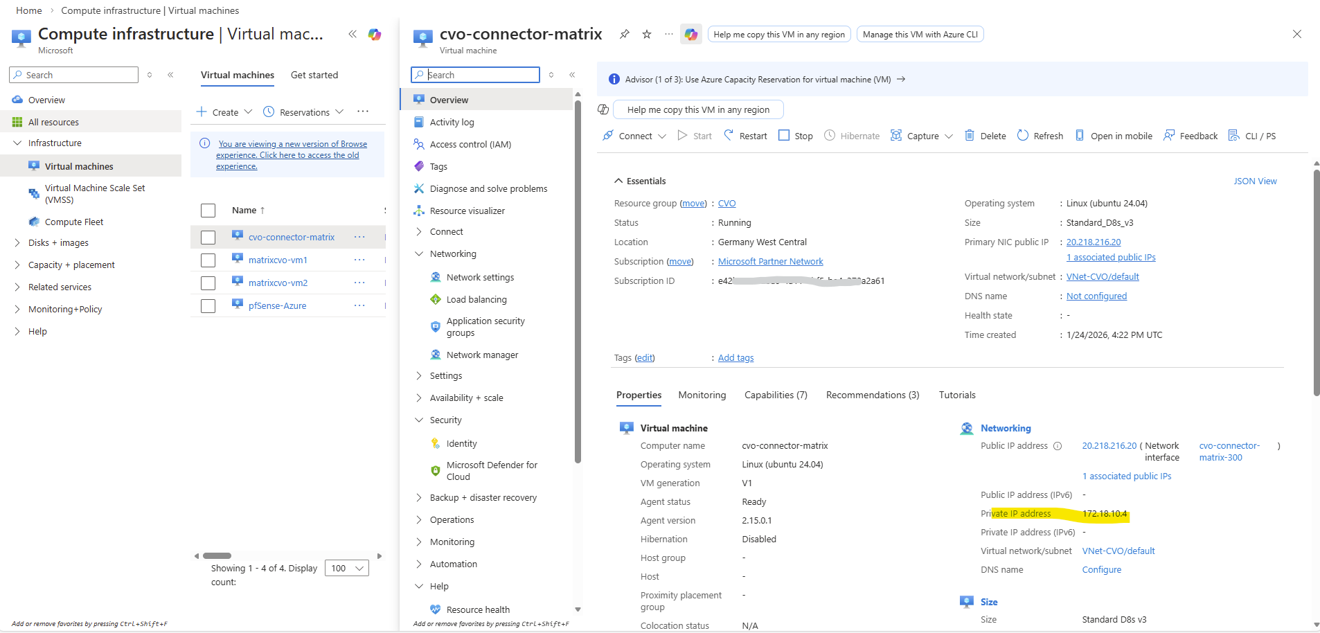 The reason for is that the route on the Agent (Connector VM) for the pfSense’s network interface and IP address 172.17.240.0/24 is missing.