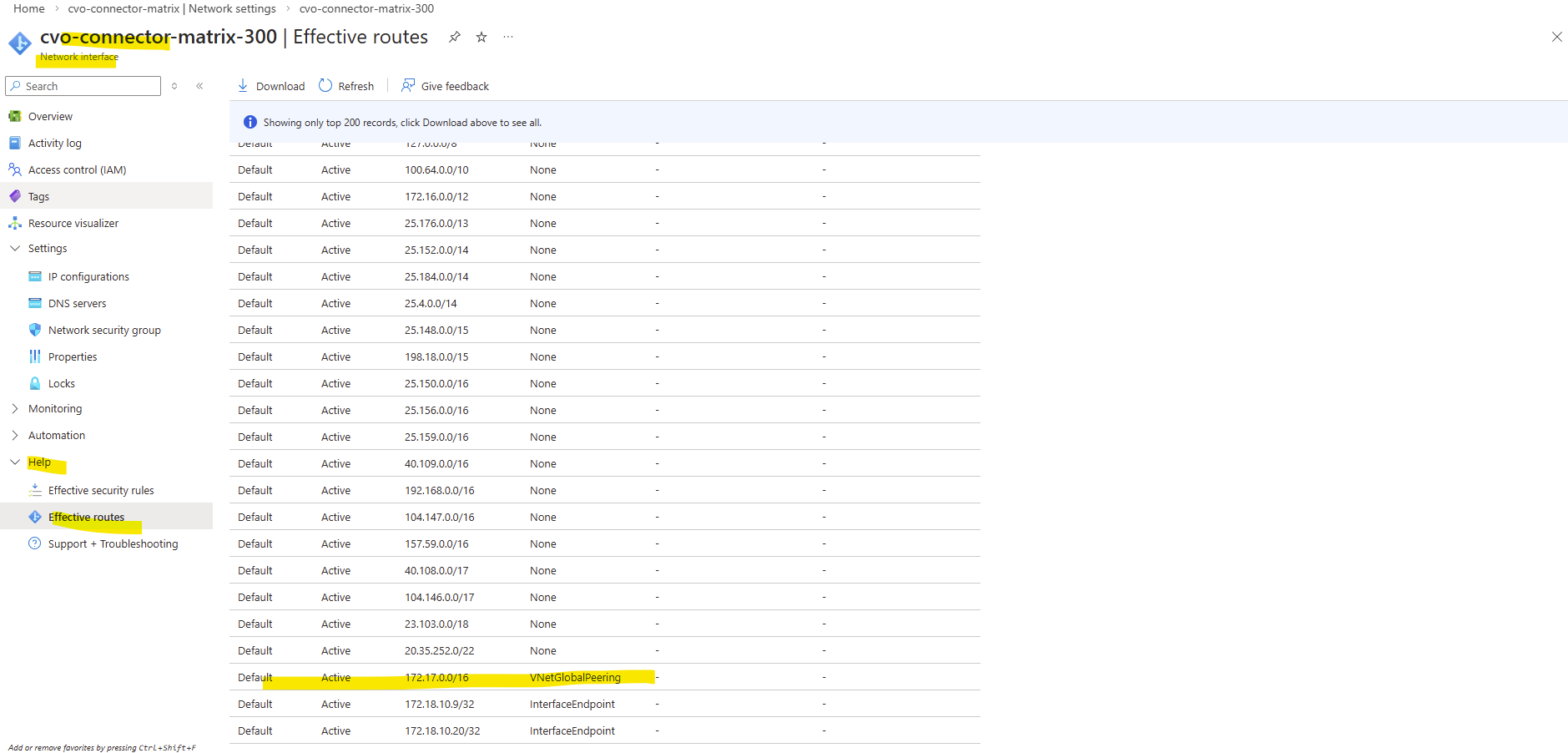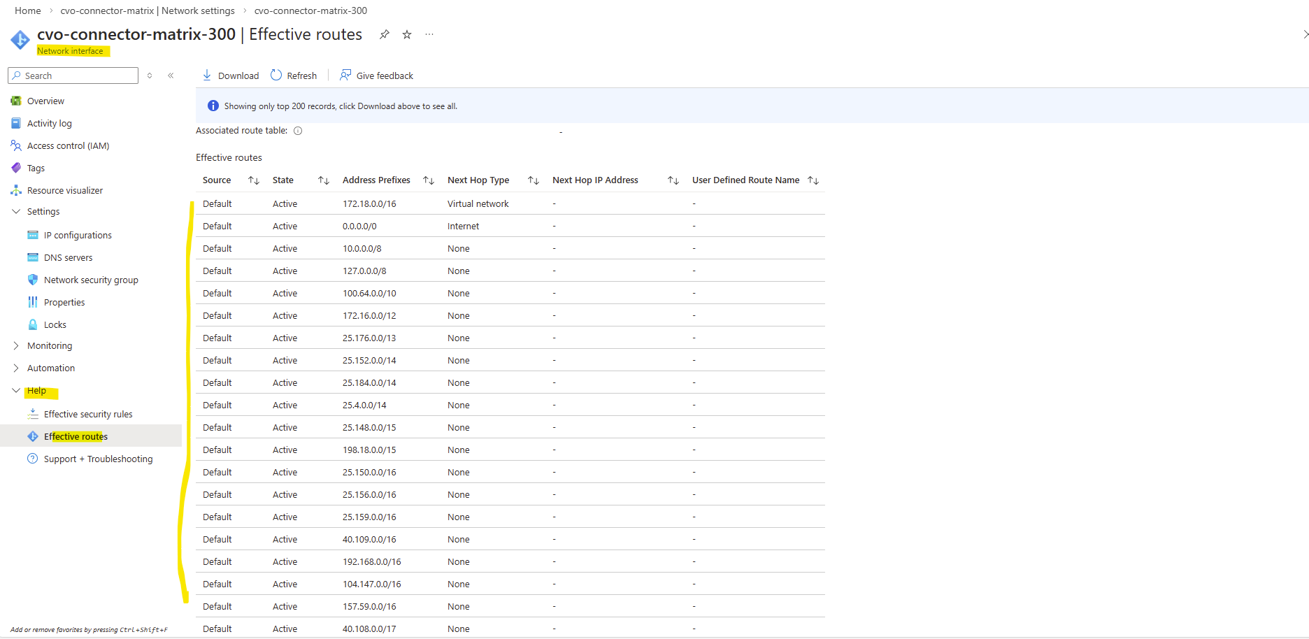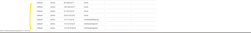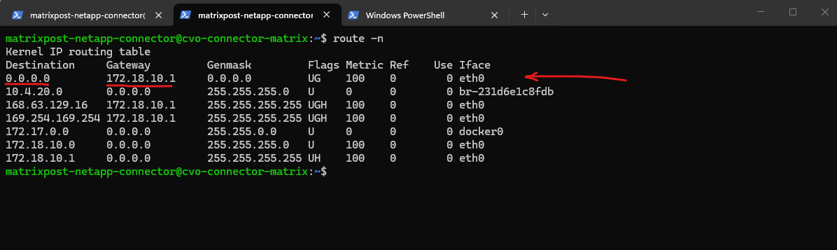 Below the we can see all routes the connector VM (OS) itself is aware of.