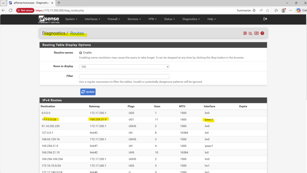 The pfSense appliance running in Azure have the following route table where also the on-prem network with 10.0.0.0/24 is listed.