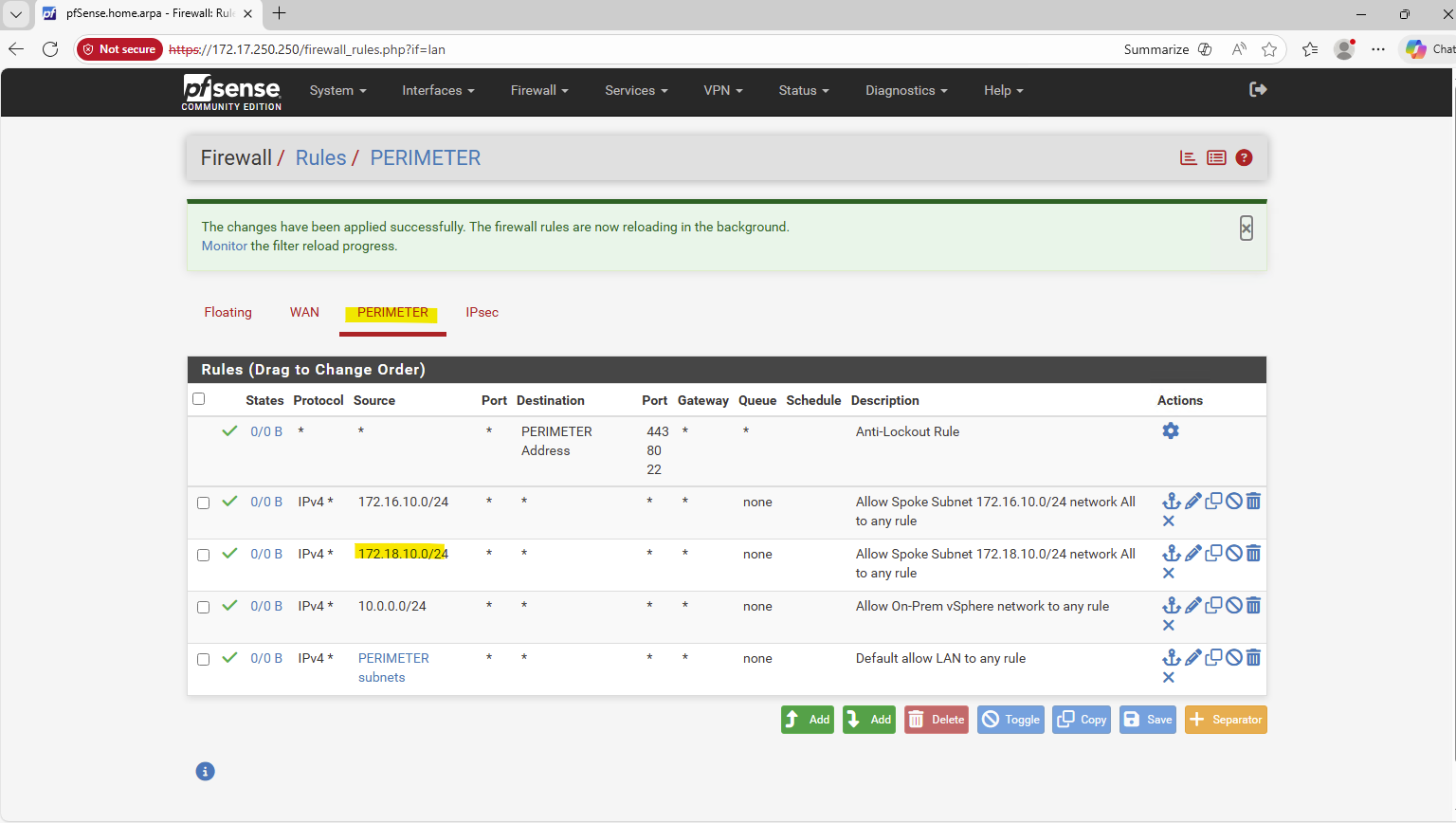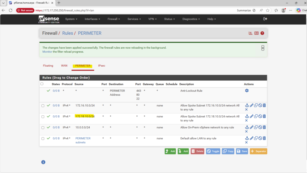 I will also allow all inbound traffic on the Azure pfSense from the CVO subnet 172.18.10.0/24.