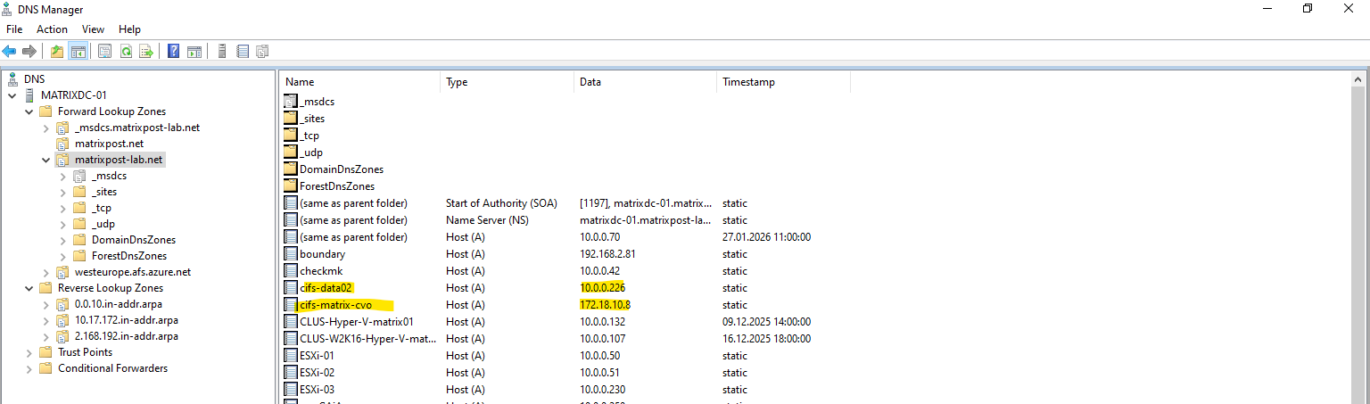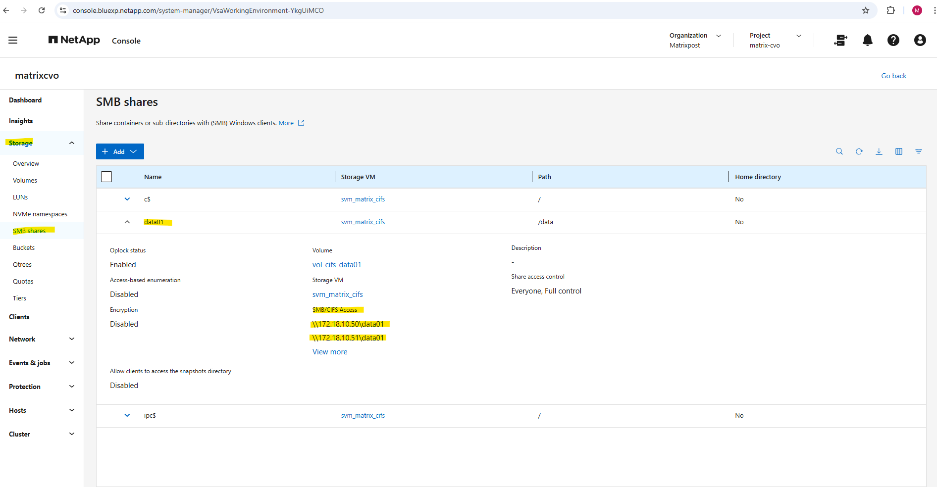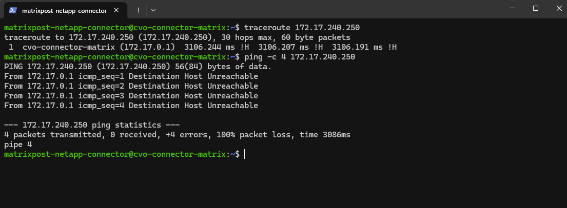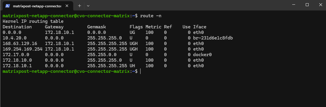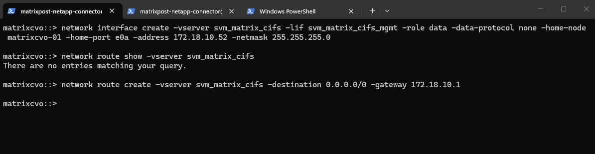 matrixcvo::> network route show -vserver svm_matrix_cifs matrixcvo::> network route create -vserver svm_matrix_cifs -destination 0.0.0.0/0 -gateway 172.18.10.1