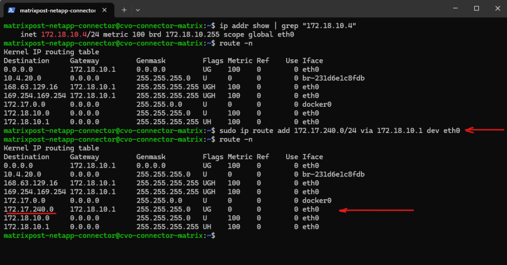 $ sudo ip route add 172.17.240.0/24 via 172.18.10.1 dev eth0