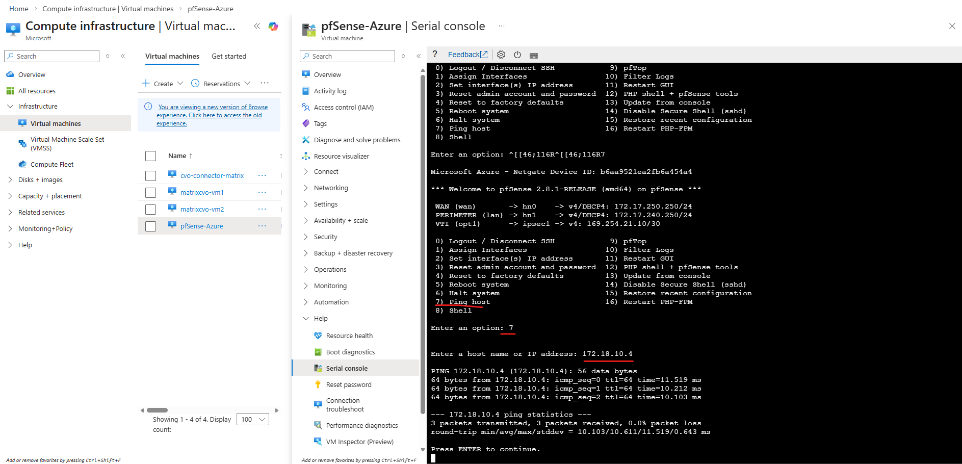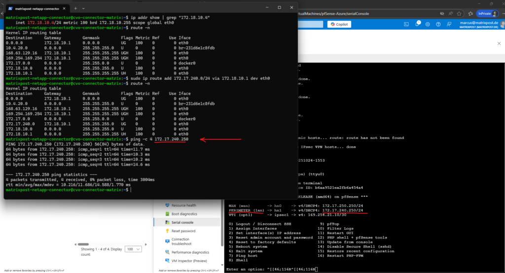 Unfortunately I still can’t ping Azure pfSense’s internal network interface and its IP address 172.17.240.250.