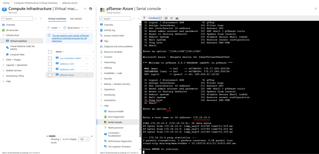 Testing if the Agent (Connector VM) can now ping the pfSense appliance running in Azure. Looks good now!