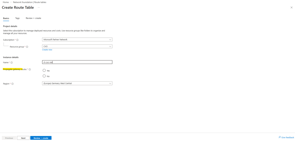 Propagate gateway routes in my case I can leave because I am not using the Azure VPN Gateway to connect my on-premise environment and instead using my pfSense appliance which will not advertise its routes by default to Azure’s internal routing fabric.
