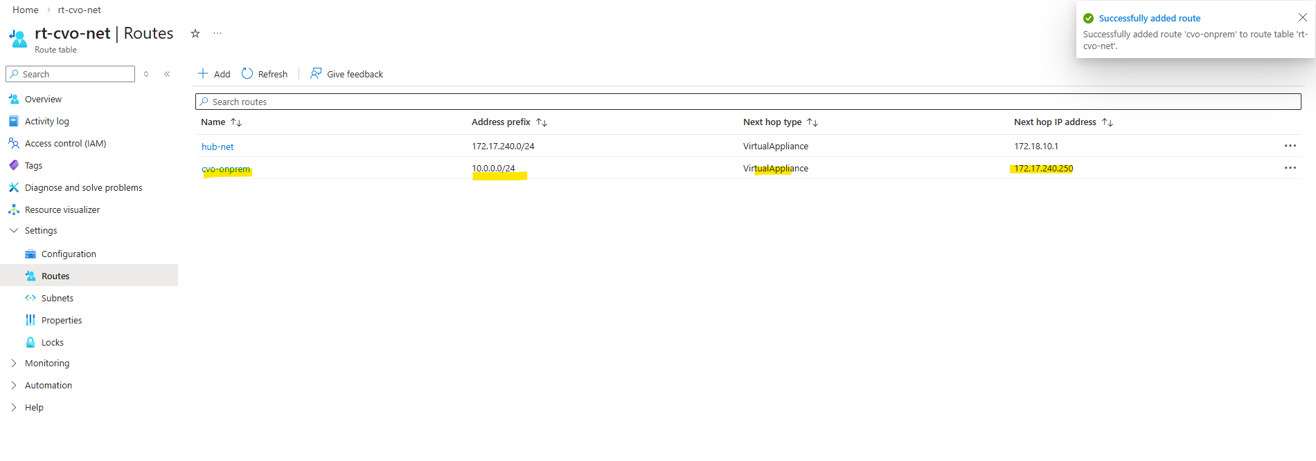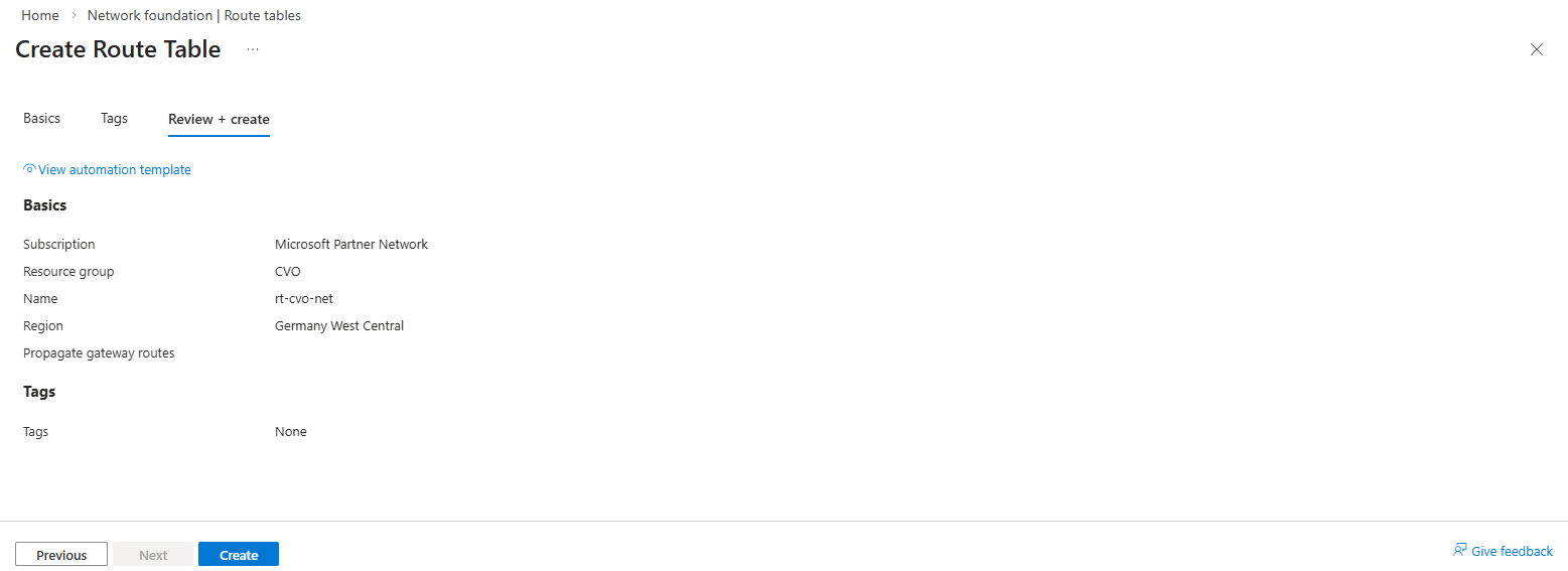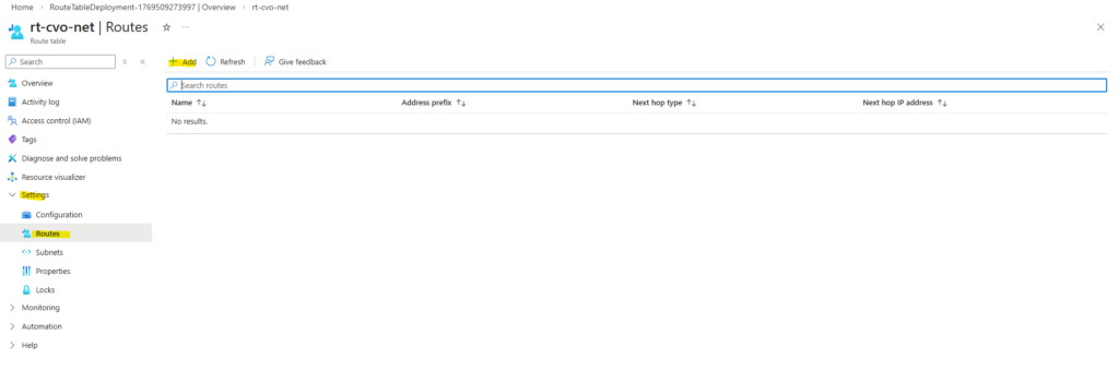 To provide these routes to all virtual machines without configuring them manually on each system in the CVO network, I will create a new route table, adding the required routes and associating it to the CVO subnet.