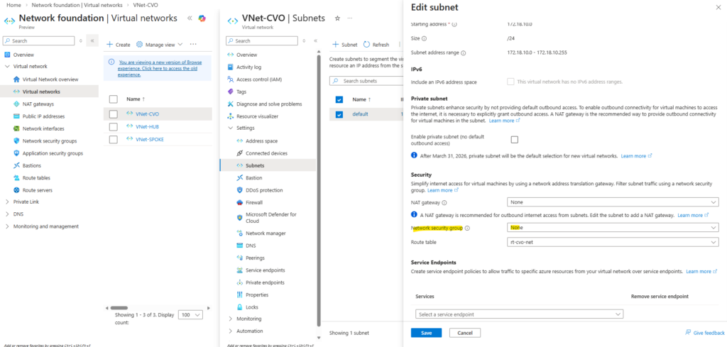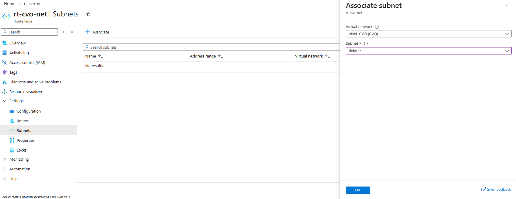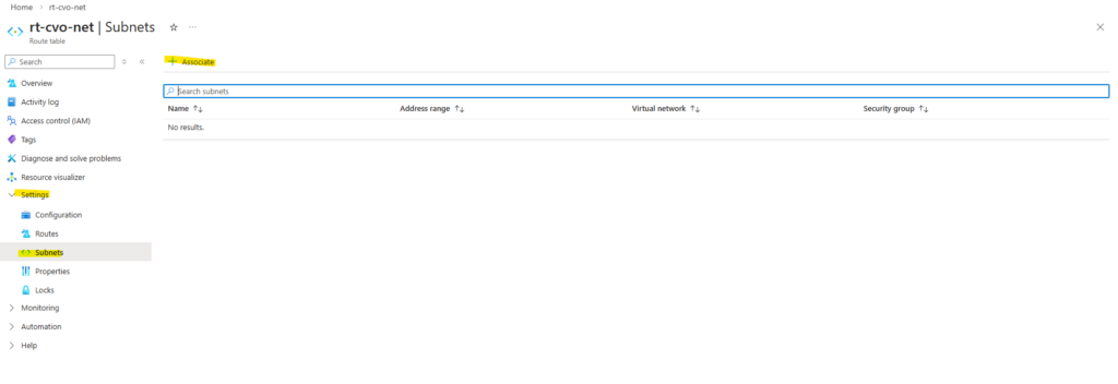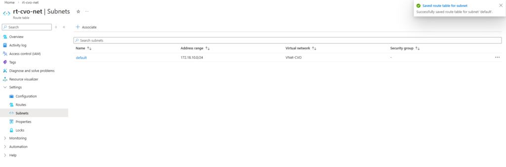 This new route table we now need to associate with our CVO virtual network and subnet in which the CVO nodes (VMs) and connector VM is running.