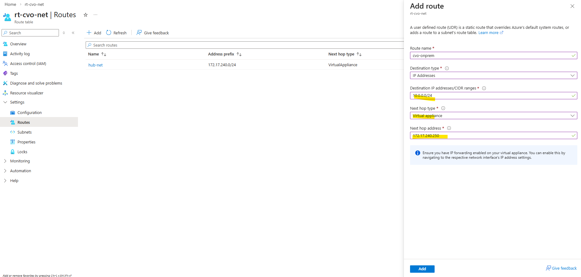 10.0.0.0/24must be forwarded to172.17.240.250(internal NIC of pfSense).So the routing logic finally is, CVO sends traffic to its default gateway (