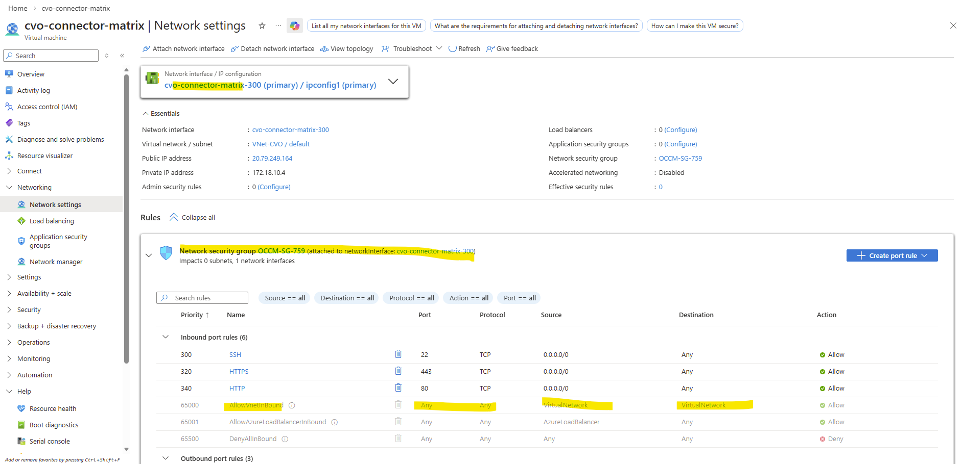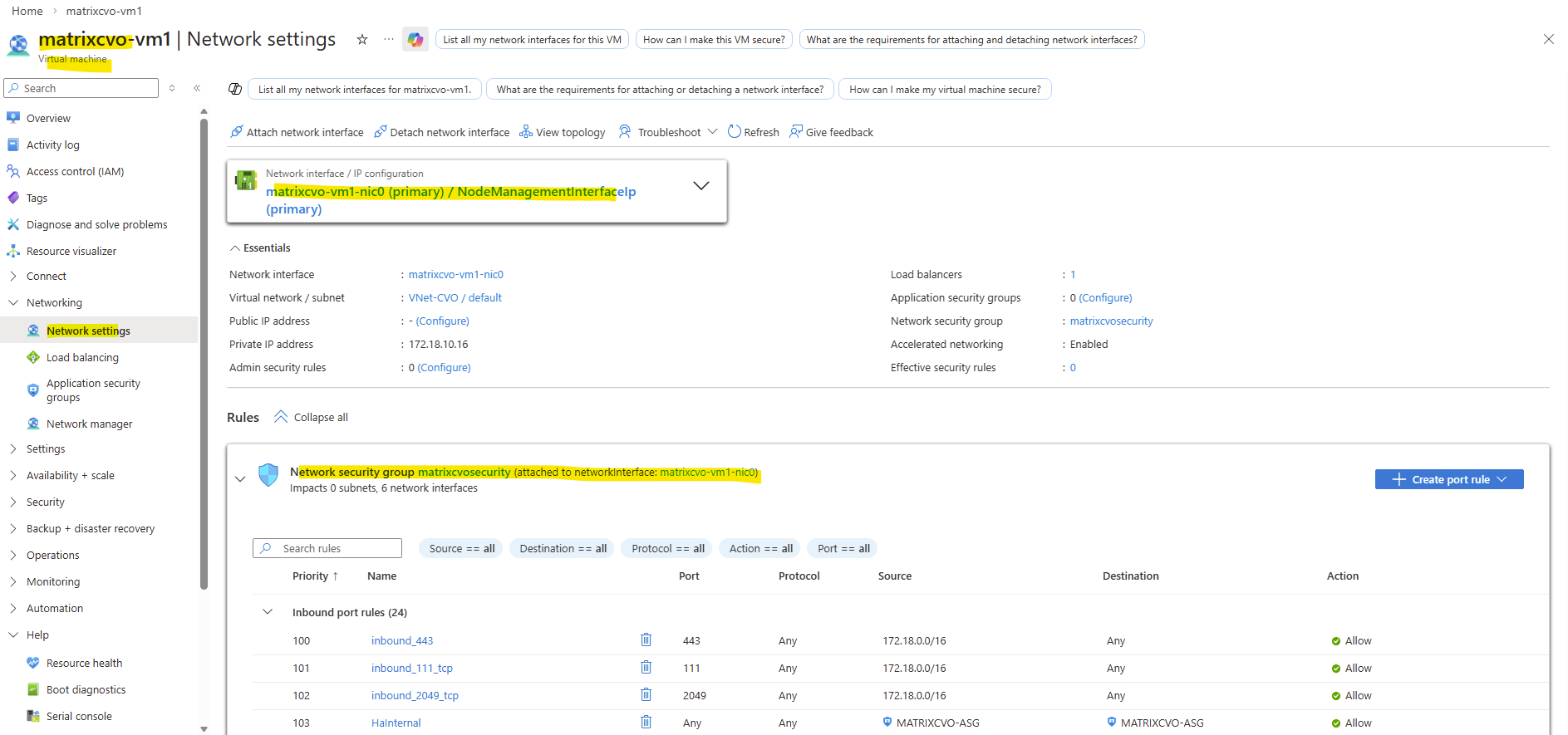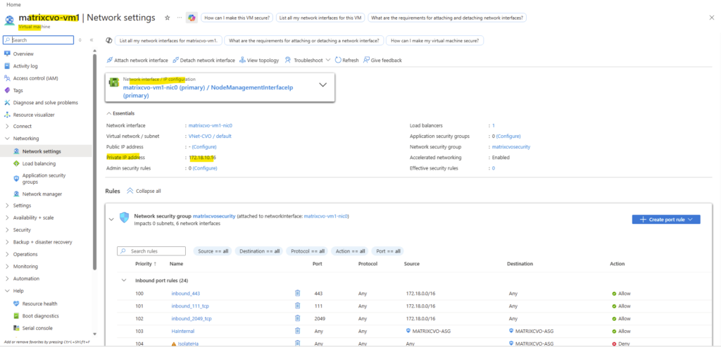 Instead a NSG is attached directly to the network interface of the nodes (VMs) like shown below. The same as for the connector VM but with different by default configured inbound/outbound rules by the NetApp console during deployment of the CVO.