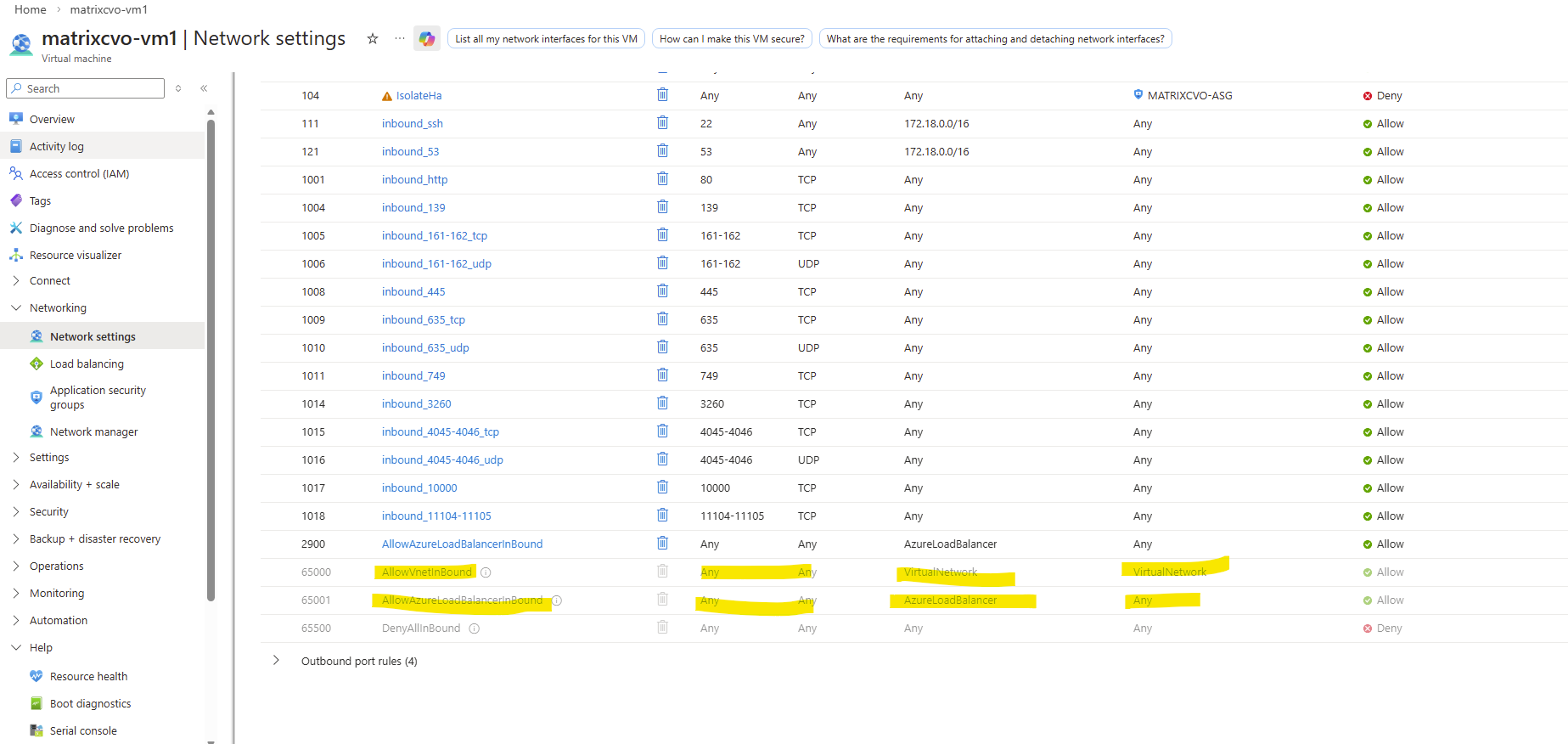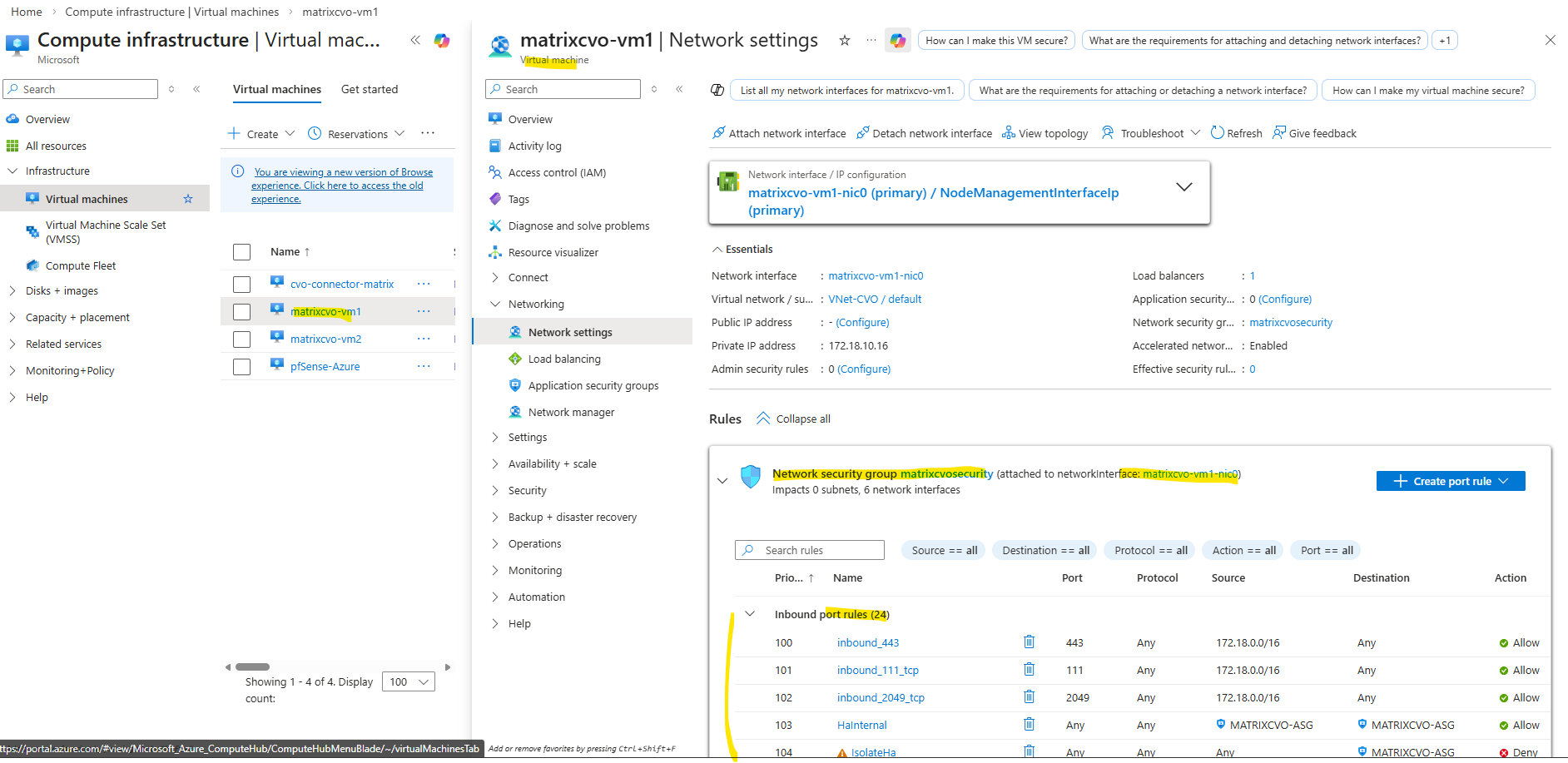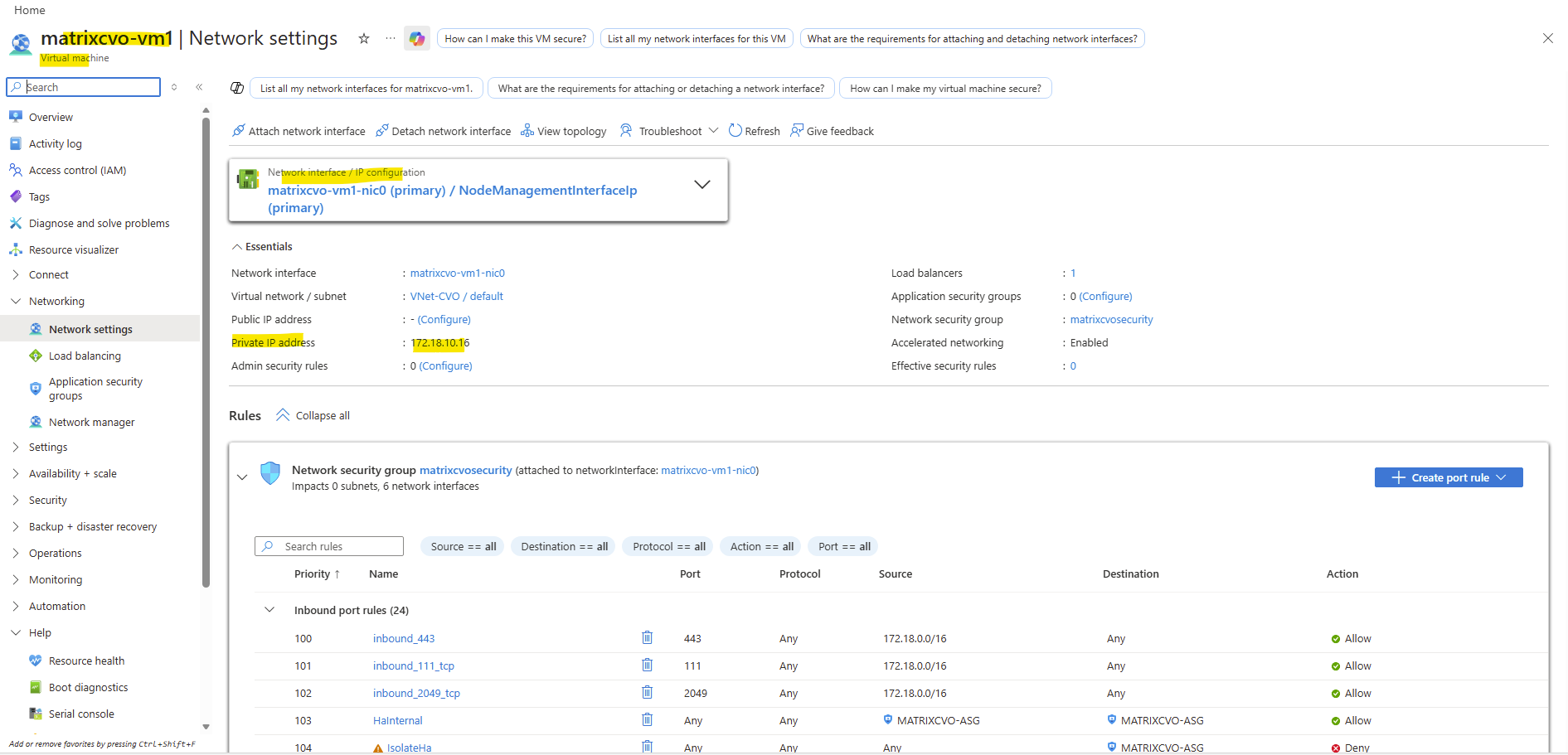 Instead a NSG is attached directly to the network interface of the nodes (VMs) like shown below. The same as for the connector VM but with different by default configured inbound/outbound rules by the NetApp console during deployment of the CVO.