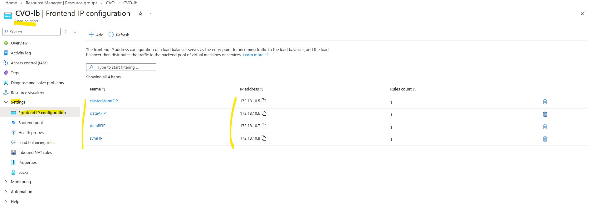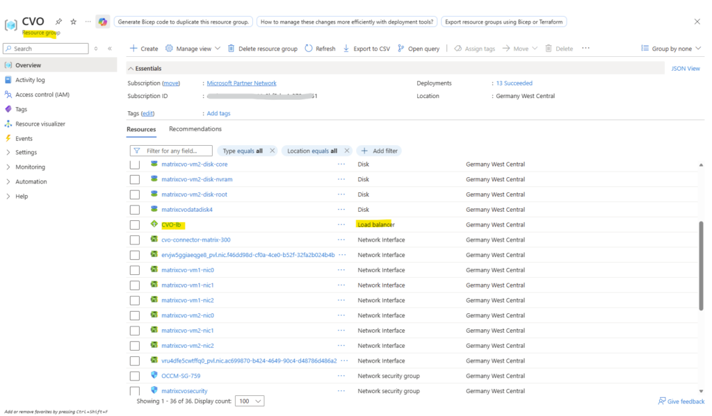 When deploying Cloud Volumes ONTAP through the NetApp Console, the Azure Internal Load Balancer (ILB) is created automatically as part of the deployment and shown below in the dedicated resource group for CVO.