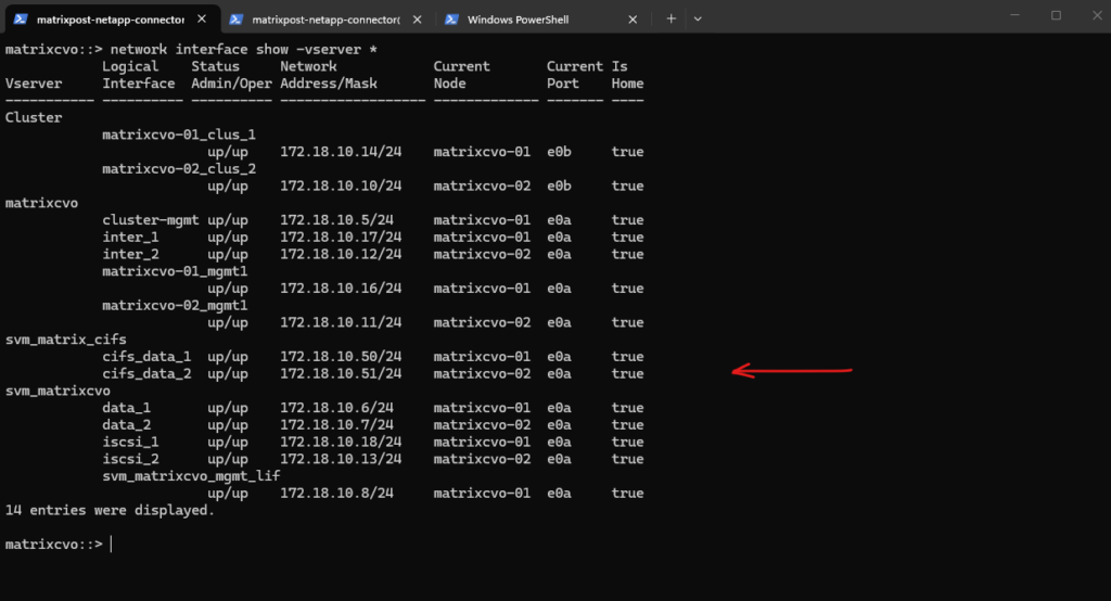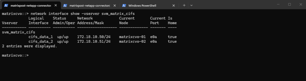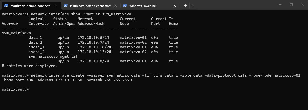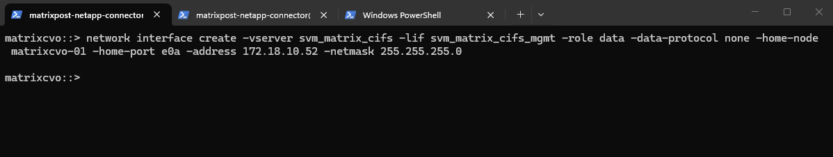matrixcvo::> network interface create -vserver svm_matrix_cifs -lif svm_matrix_cifs_mgmt -role data -data-protocol none -home-node matrixcvo-01 -home-port e0a -address 172.18.10.52 -netmask 255.255.255.0